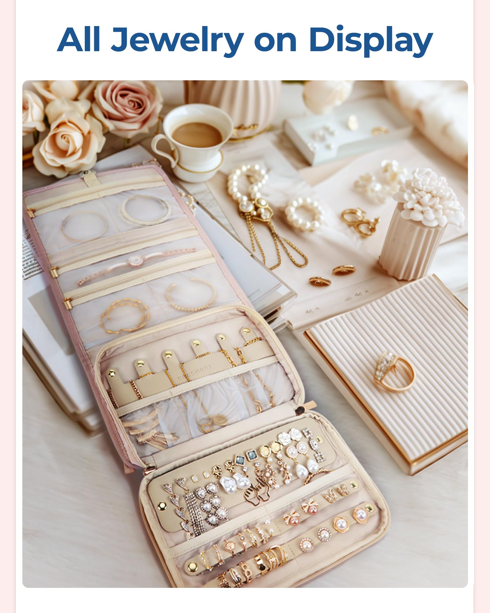 I was traveling to attend business meetings, formal events and casual outings with friends, so I needed a larger travel jewelry case to hold all my different types of jewelry. I ordered 2-3 different jewelry cases. This jewelry case was more than expected. All the compartments and features to hold all my different kinds of jewelry was great! I was able to arrange my bracelets, earrings, fine necklaces, costume jewelry, and rings in the zippered pockets or on the straps provided. It folded up nicely with A LOT of jewelry! I was able to tuck it in my suitcase without taking up a lot of space. I gave it 4 stars because the straps that holds the rings unsnaps very easily causing the rings to fall off. I also found the earring feature to be a bit cumbersome for my stud earrings. I ended up not using it and just using the zippered pockets for all my earrings. Bottom line….. I would purchase another one and give it to a friend as a birthday gift.