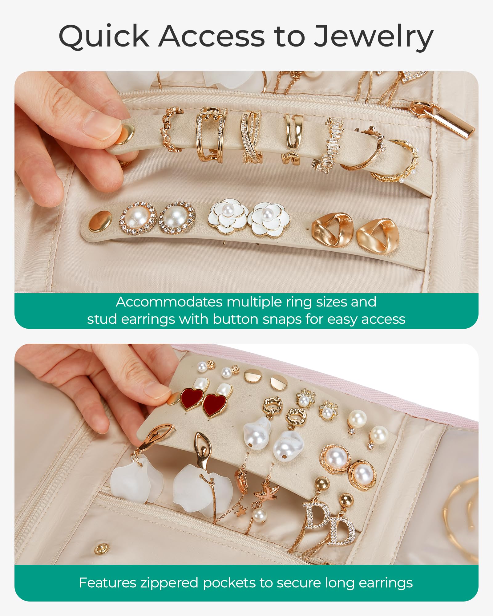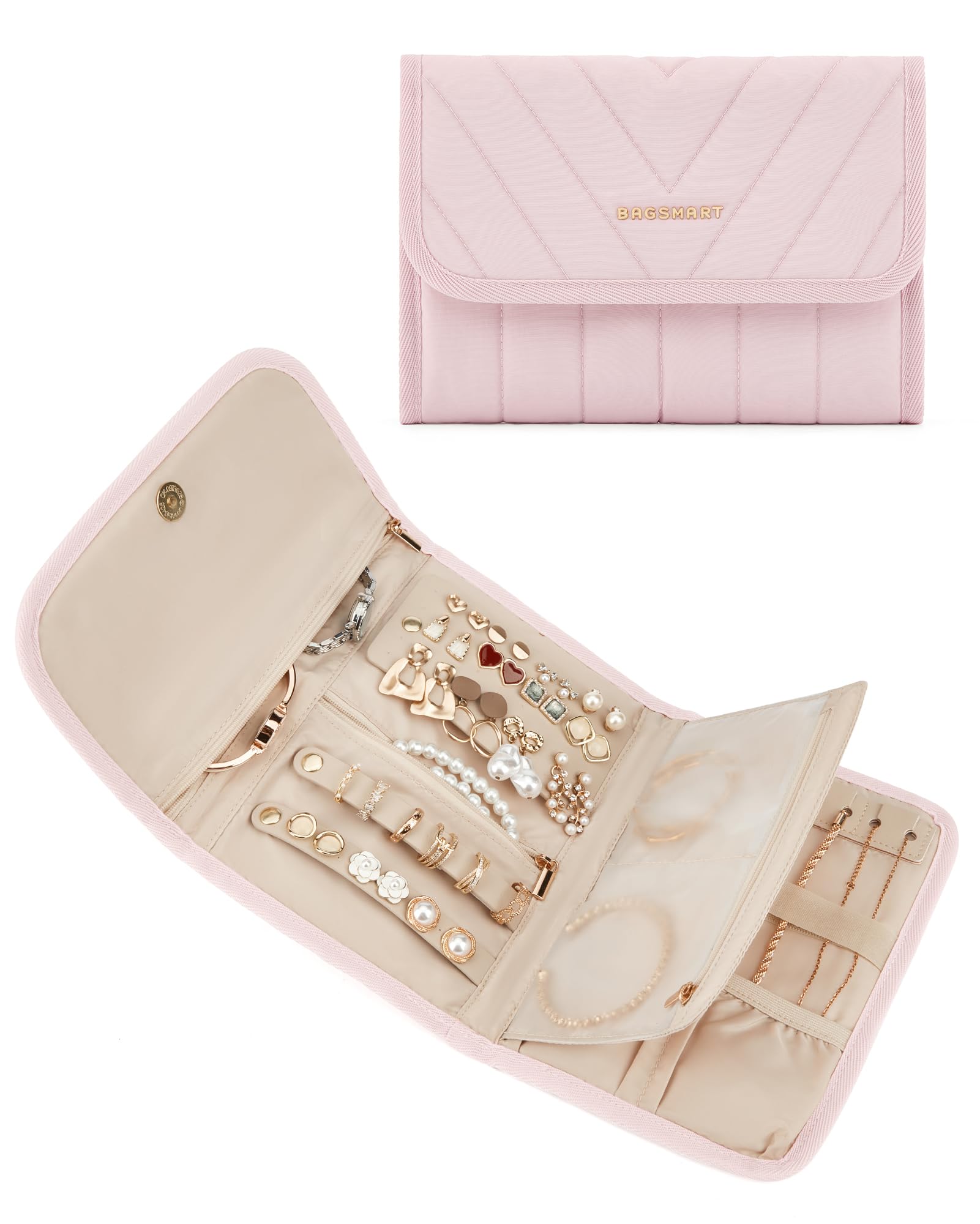 BAGSMART Travel Jewelry Organizer Case, Foldable Jewelry Roll for Necklaces, Earrings, Journey-Rings, Bracelets, Brooches, Portable, Pink