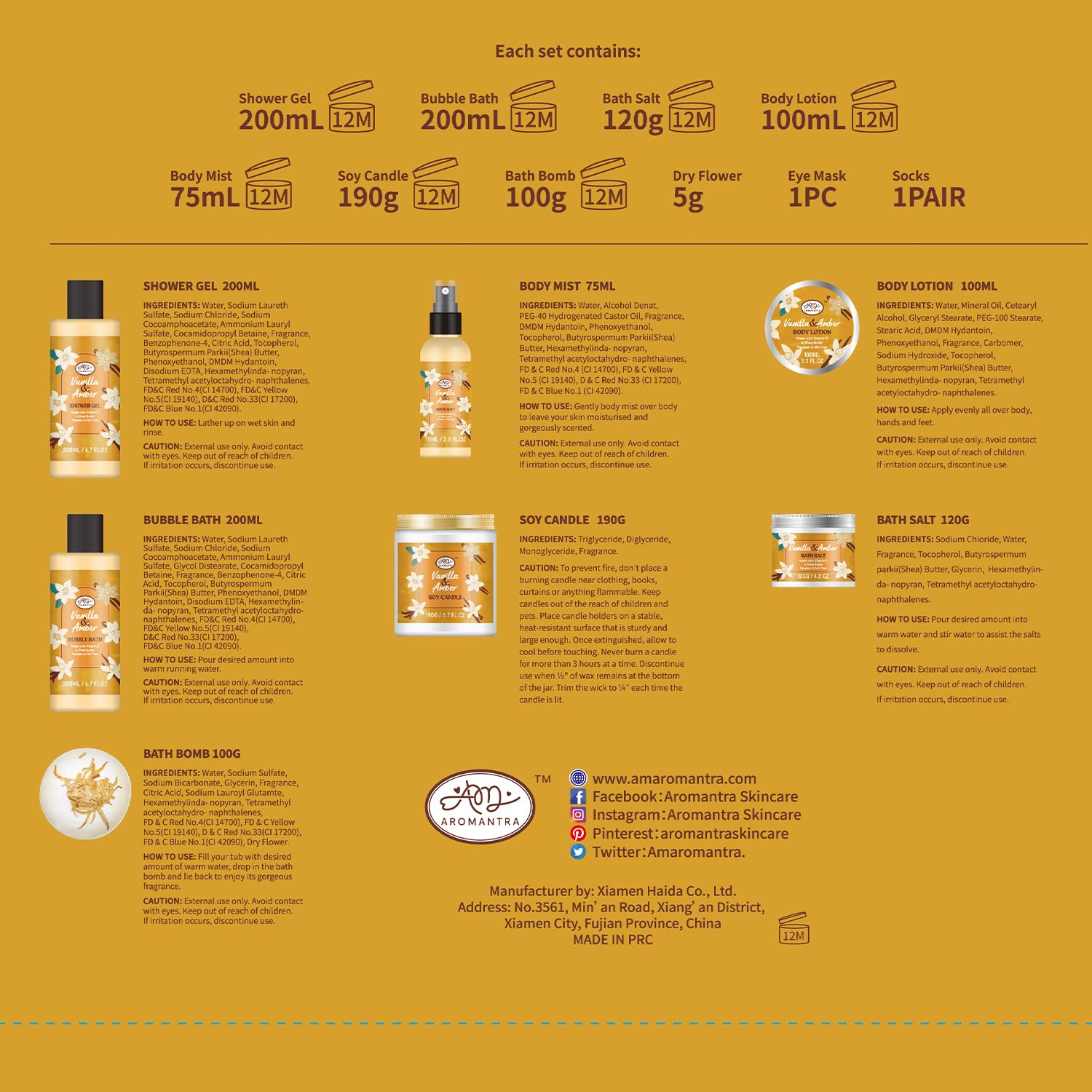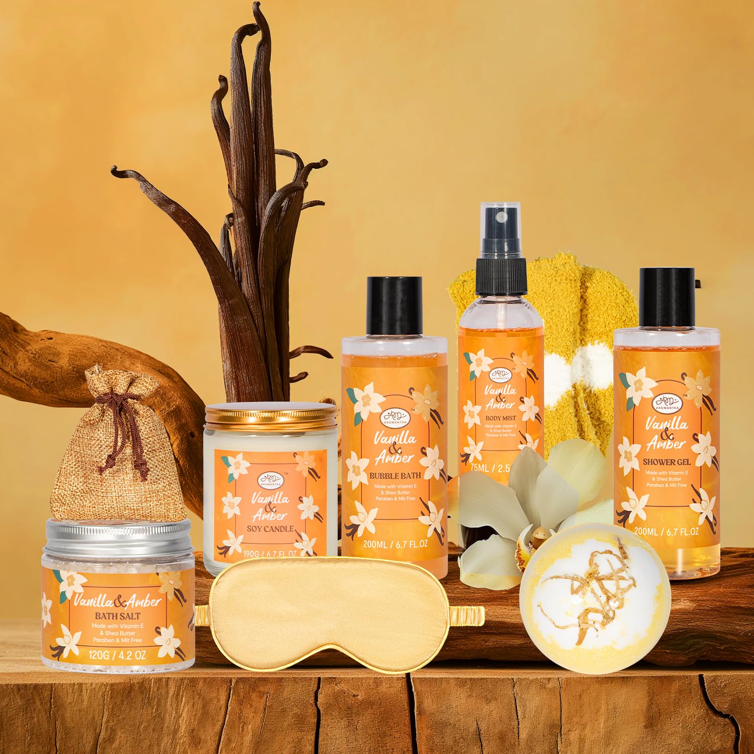 - 11 PCS WOMEN'S BEAUTY GIFT SET: This vanilla scented self-care gift set contains 1*Shower Gel, 1*Bubble Bath, 1*Bath Salt, 1*Body Lotion, 1*Bath Bomb, 1*Body Mist, 1*Soy Candle, 1*Dry Flower Sachet Bag, 1*Eye Mask AND 1 Pair of Socks