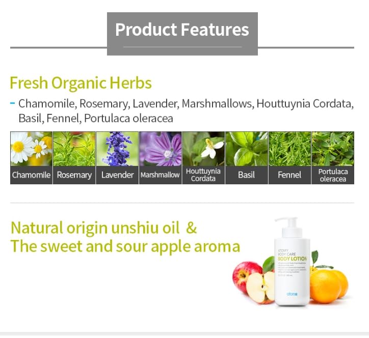- Atomy Body Lotion contains 9 kind of fresh herbs, tangerine oil (Unshiu) and apple water to refresh your tired skin and to keep your skin moisturized and smooth! Herbs extract embraces dried skin and gives elasticity and vitality to the skin.