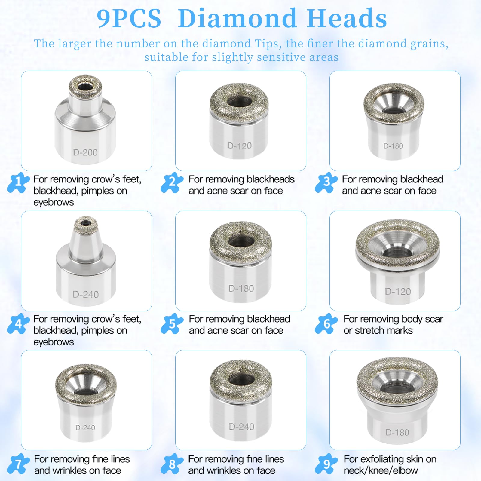 - 〖9 Different Diamond Tips〗Beauty Star upgraded Diamond Microderm Machine including 9pcs profesional Diamond Tips. It suits for face, forehead, chest, nose, neck, near eye area