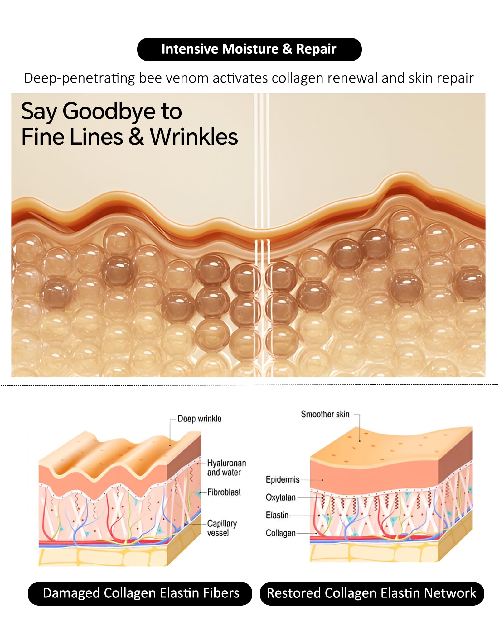 - Firming and Lifting – This Bee Venom Skin Treatment Cream contains bee venom peptides that gently stimulate the skin to support natural collagen and elastin production, improving overall elasticity. With regular use, it helps smooth the appearance of wrinkles, crow’s feet, and sagging skin, leaving your complexion visibly firmer and more lifted.