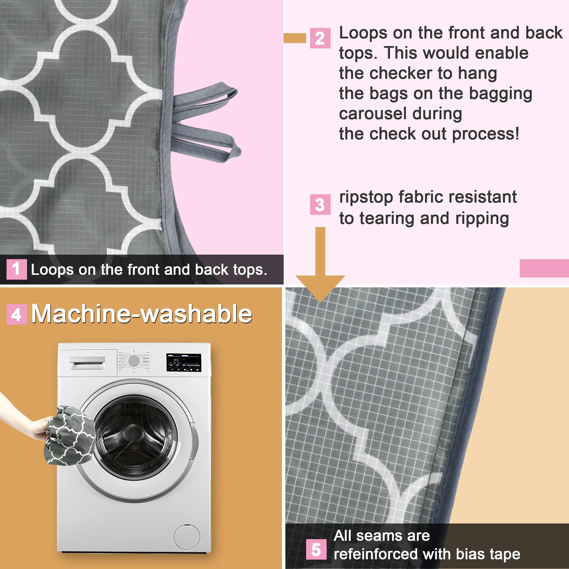 - RIPSTOP FABRIC: These reusable groceries bags are made of 100% RIP-STOP polyester cloth which is ideal fabric for washable holiday bags. It is Lightweight but VERY Sturdy and Resistant to Rips and Water. These large reusable tote bags have cute pattern design. Perfect as party favors gifts for women. And can add some fun to your shopping grocery by using large reusable shopping tote bags like these.
