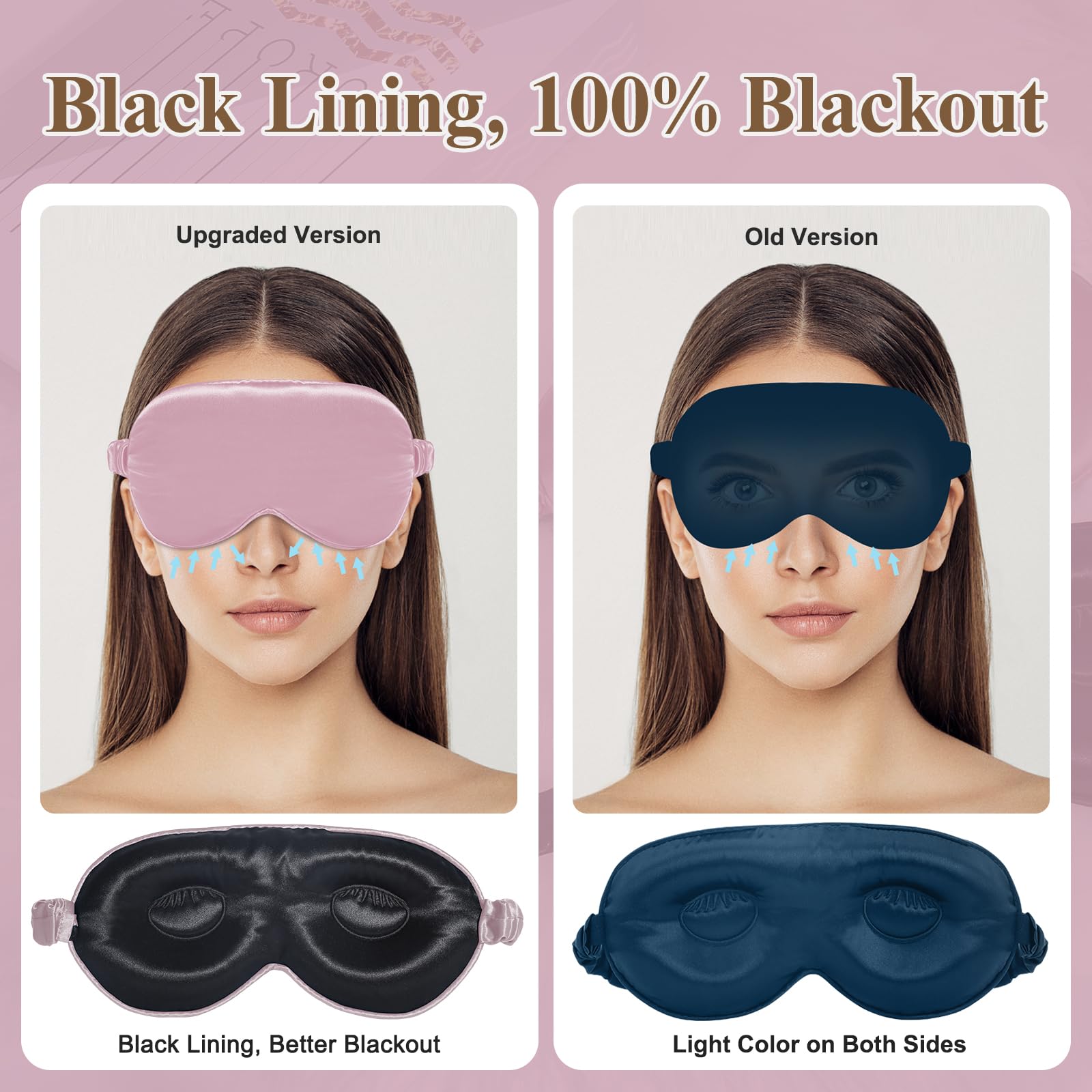 - 【 Ergonomic 3D Eye Hollowed Design, NO Pressure on Your Eyes 】 To allow your eyes to blink free & your skin sweaty-free, we created the most comfortable 3d silk sleep eye mask with Ergonomic 3D design & breathable fabric. This 3d contoured blindfold gives extra space around the eye area so you can wear it without messing your eye lash extensions or false eyelashes! With NO pressure on eyeballs or foreheads, BeeVines 2 pack light blocking sleeping masks are perfect for women & men!