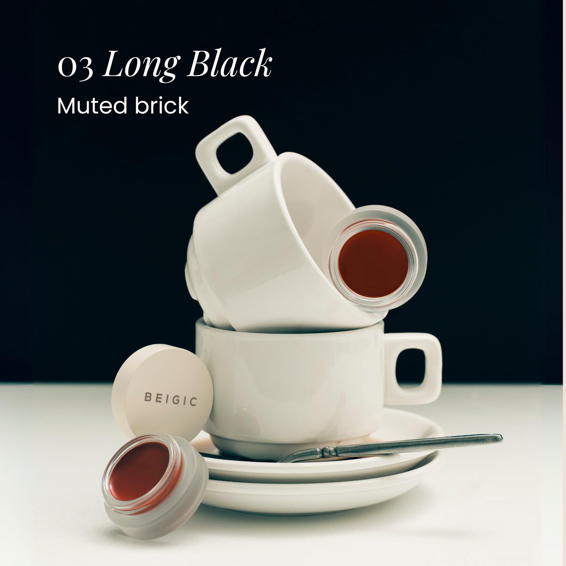 - 03 LONG BLACK: A warm, earthy burnt terracotta that adds a chic, modern touch. This versatile shade can be used to create a subtle contour on cheeks or as a powerful, elegant color for a statement lip.