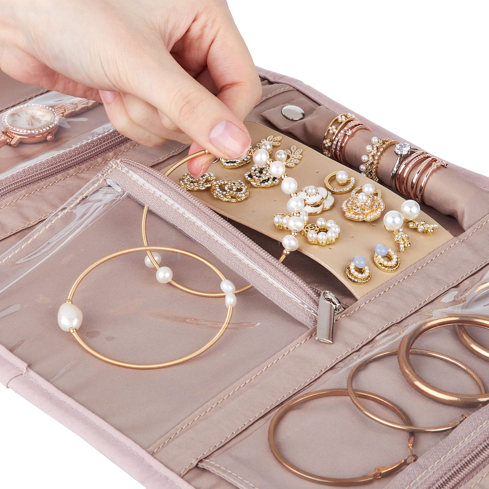BELALIFE Travel Jewelry Case Organizer, Medium Foldable Storage Roll for Earrings, Necklaces, Rings, Bracelets, Brooches, Pink