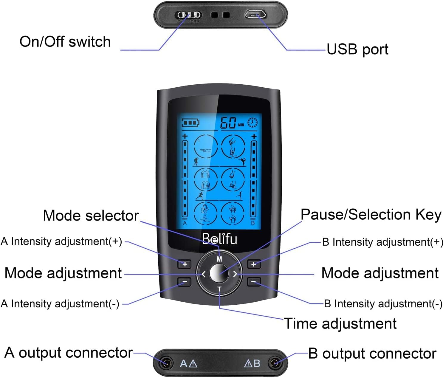 Belifu Dual Channel TENS EMS Unit 24 Modes Muscle Stimulator for Pain Relief Therapy, Electronic Pulse Massager Muscle Massager with 10 Pads, Dust-Proof Drawstring Storage Bag, Fastening Cable Ties