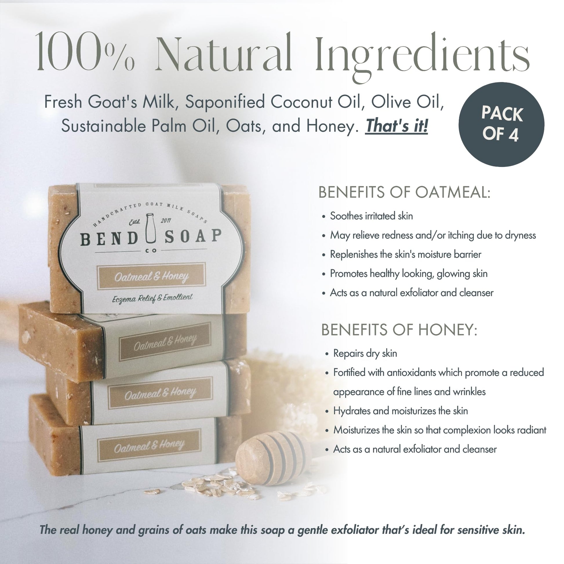 Bend Soap Company All Natural Handmade Goat Milk Soap for Dry Skin Relief, Oatmeal & Honey, 4.5 oz 4 pack
