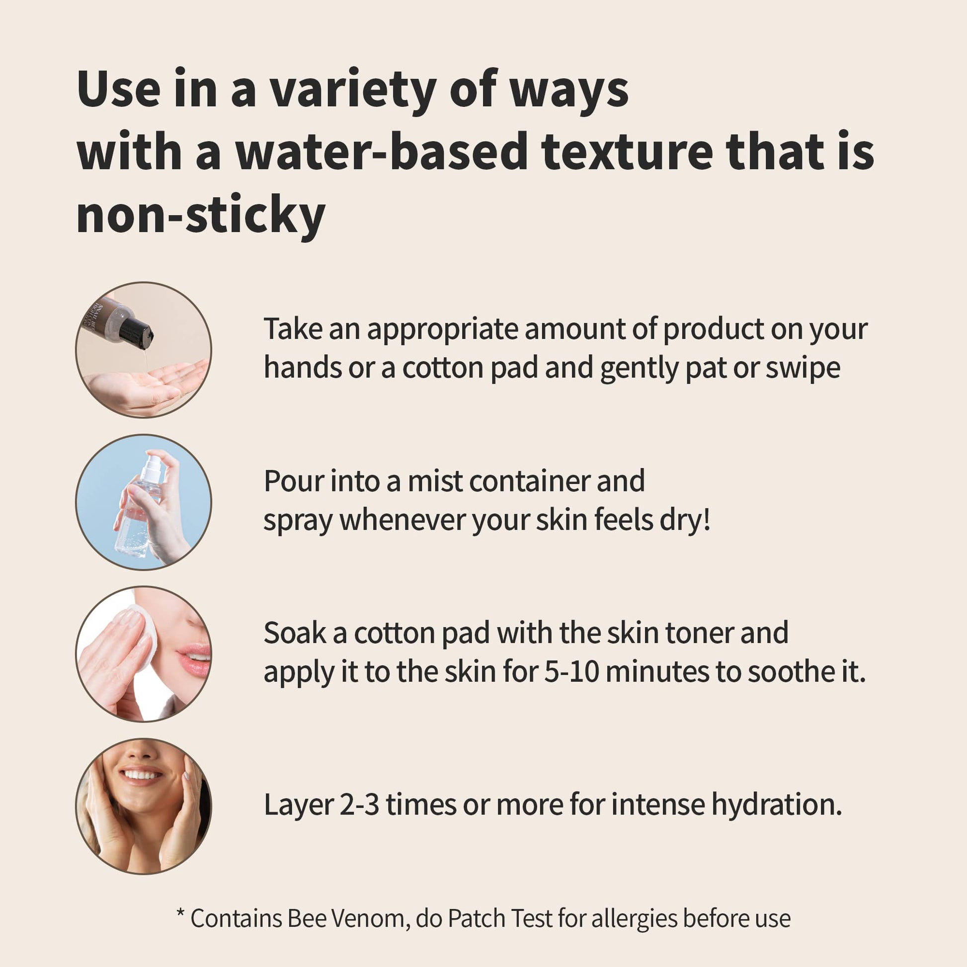 - [FAITHFUL to CLEAN BEAUTY] Volatile Alcohol-FREE, No Thickener, No Artificial Fragrance/Coloring, 20 Cautious Ingredients-FREE, No Harmful Controversial Ingredients like Silicon. * Contains Bee Venom, Patch Test for allergies before use.