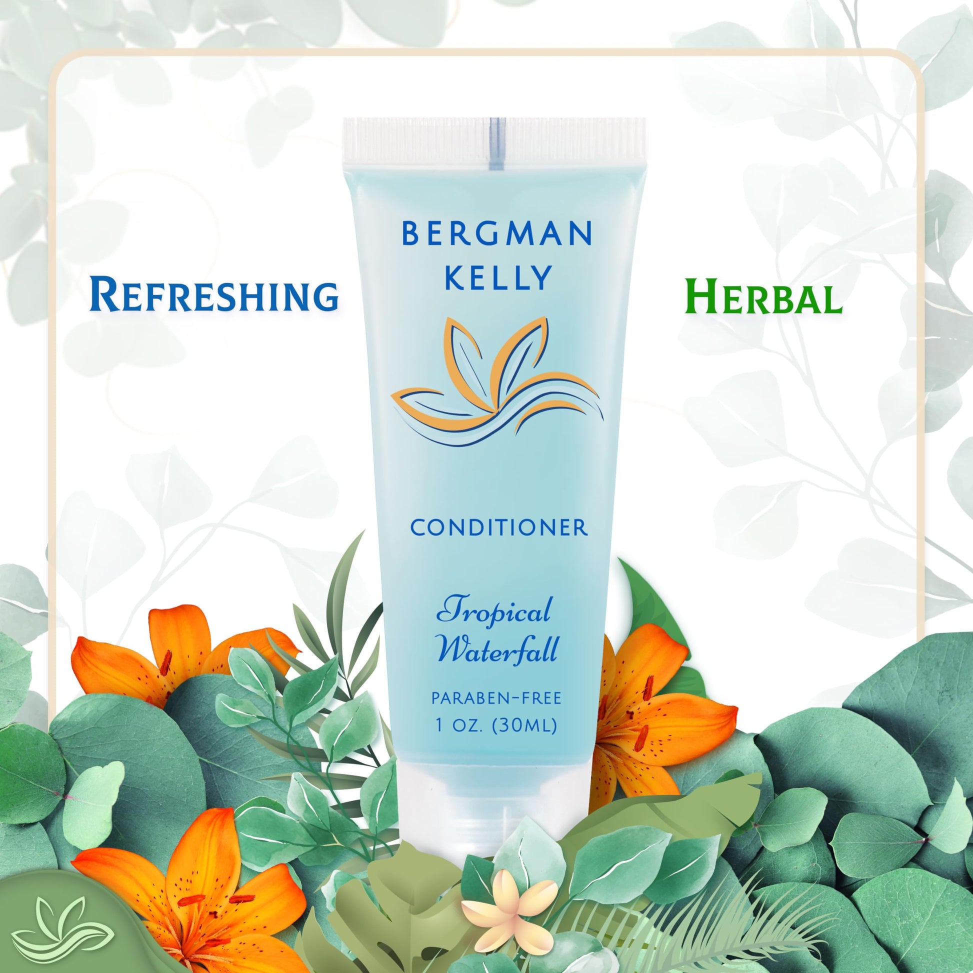 BERGMAN KELLY - Hotel Toiletries Bundle - Tropical Waterfall, 1 oz each, 125 Pieces - 5-Piece Set: 25 each Round Bar Soap, Shampoo, Conditioner, Body Lotion & Body Wash - Bulk Mini Guest Amenities