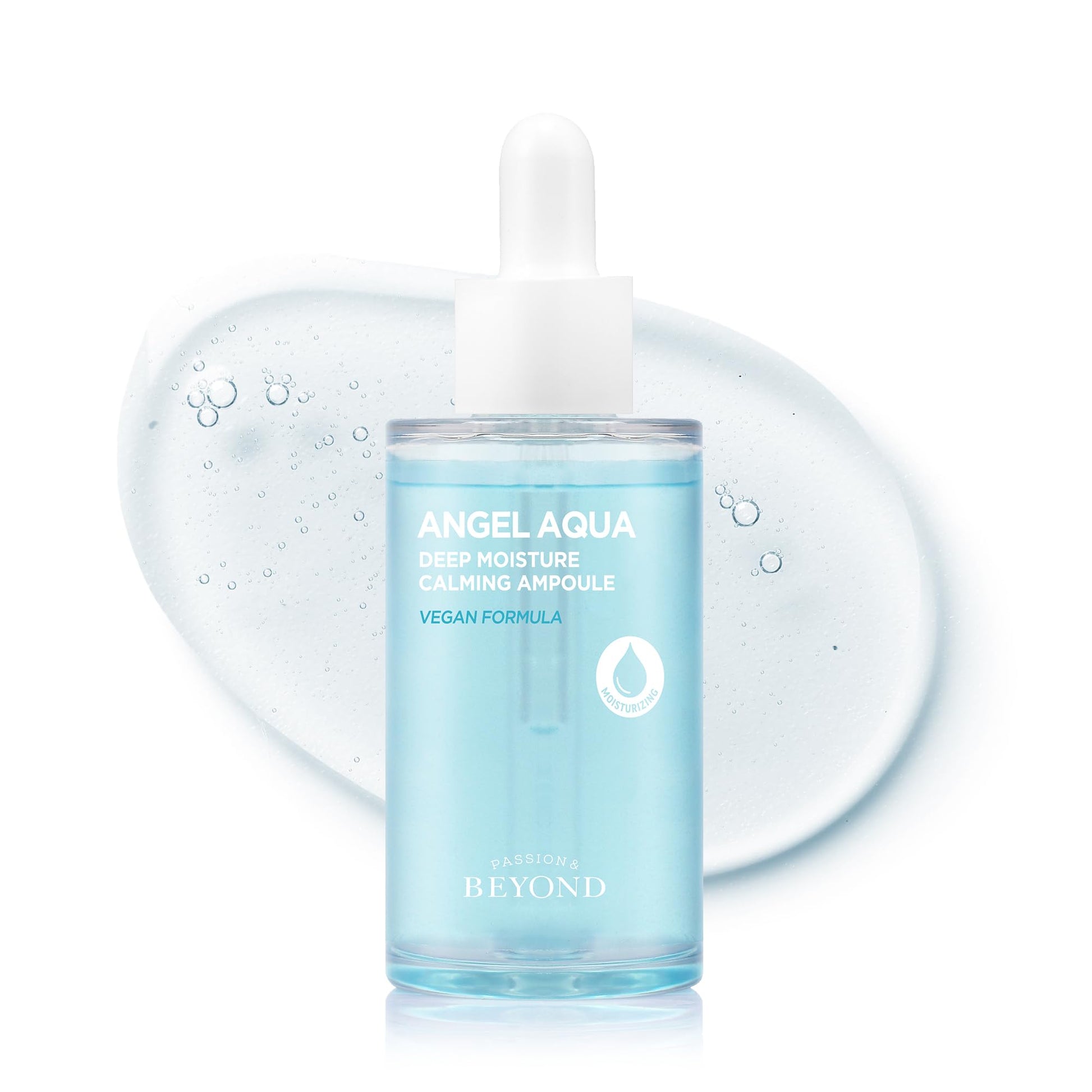 - BEYOND ANGEL AQUA DEEP MOISTURE CALMING AMPOULE (50ml/1.7fl oz x 2) - A powerful serum designed to deeply hydrate, soothe, and lock in moisture, offering immediate relief from dryness and tightening sensations. Its gel-like texture is rich and non-sticky, providing a luxurious feel upon application.