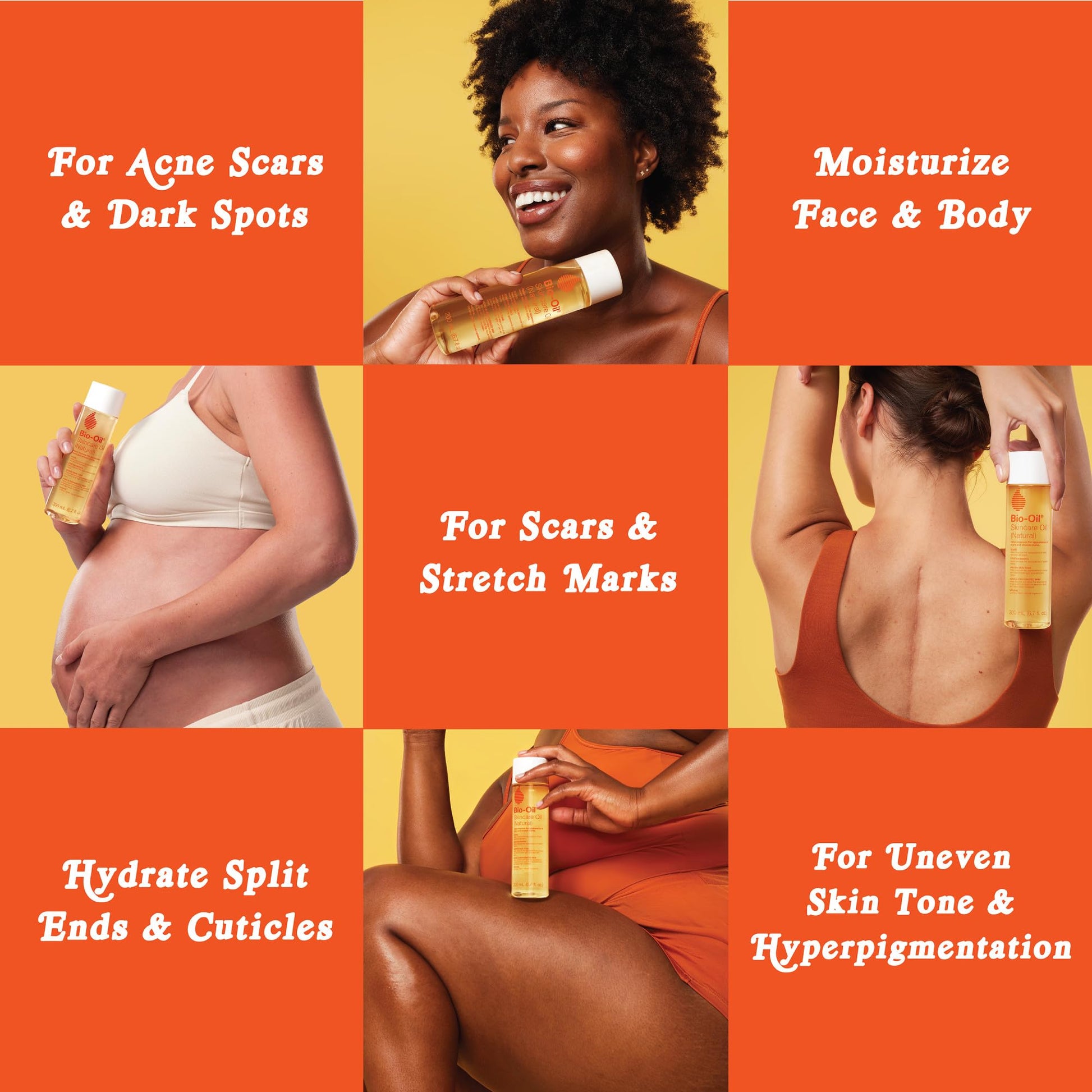 Details: Give your skin a break while stuck inside! It's the perfect time to care for your skin with Bio-Oil Natural Skincare Oil. Made for all skin types, this paraben and mineral oil-free body and face oil for dry skin is carefully formulated with all natural ingredients to hydrate dry, damaged skin while healing scars, stretch marks, and uneven skin tone. This all natural brightening serum contains no added or artificial fragrance, so you can feel safe about what you're putting on your skin. Bio-Oil Natural Skincare Oil is designed to help improve the appearance of stretch marks, scars, and other marks due to surgery, injury, acne, aging, pregnancy, and more — with completely natural ingredients. Not only does this unique, clean beauty formula help heal old scars — it also work preventatively, with organic jojoba oil and rosehip oil to help tired, dull skin retain moisture for a softer, brighter complexion and dry skin relief. It also features chia seed oil and pomegranate seed oil to help protect your skin. This facial skin care product has a fast-absorbing, non-comedogenic formula that won't clog pores or irritate sensitive skin, making it a perfect all natural face moisturizer for women. Made out of all natural, plant-based ingredients and essential oils, this product is non-irritating and safe for sensitive skin. The toxicological profile, chemical structure, level of inclusion and total level of daily exposure of each ingredient used has been assessed in clinical trials and deemed safe for use (including for use by pregnant women). Not only is this a facial moisturizer — Bio-Oil can be used in many ways, including as a beard oil, cuticle oil, hair oil, scalp oil, face oil, lip oil, and nail oil. Bio-Oil's deeply moisturizing properties make it a great hair oil for dry and damaged hair for women with all hair types. Bio-Oil is proudly distributed in the USA by Kao USA, Inc. Satisfaction Guaranteed. Limitations may apply.