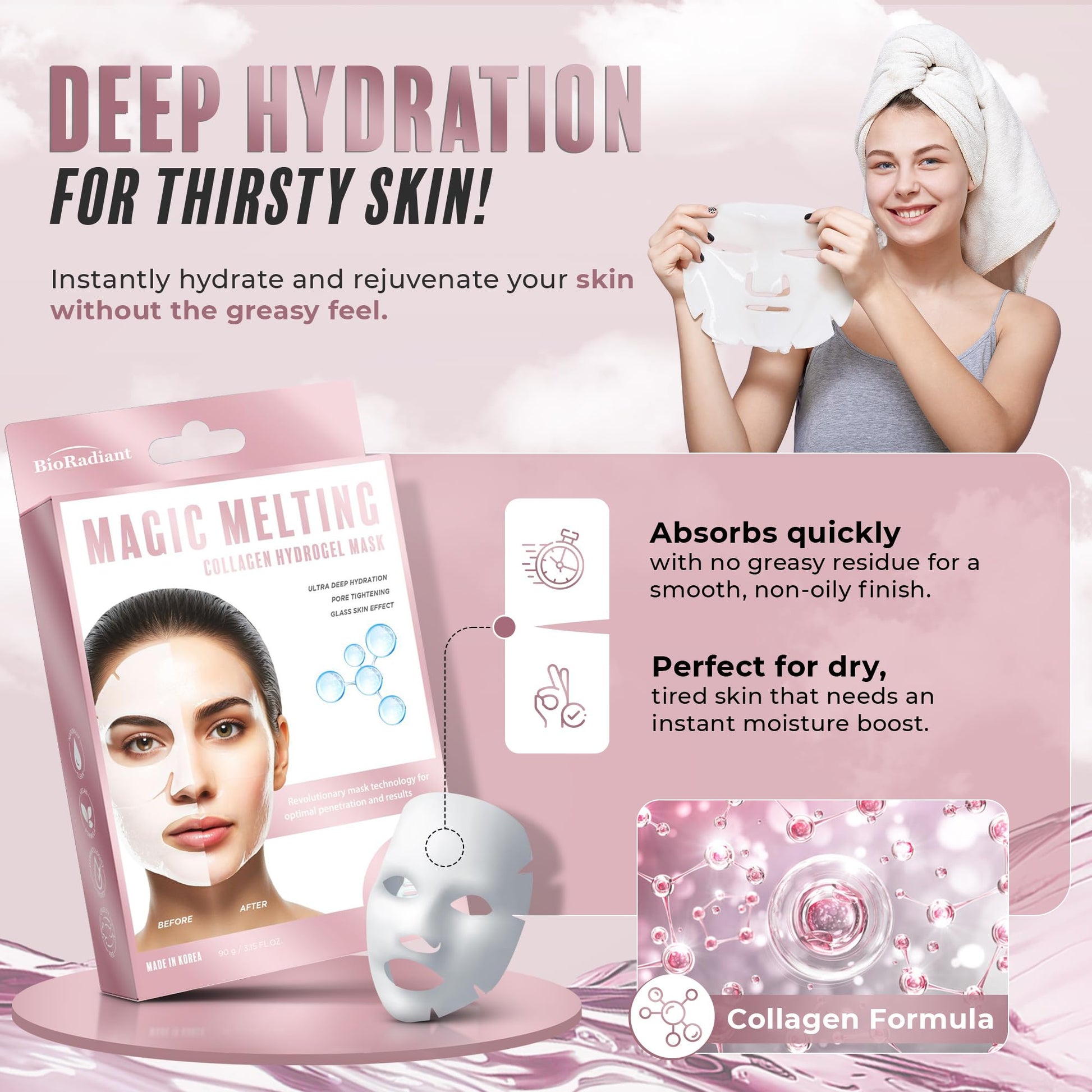 Bio Radiant Magic Melting Face Mask - Collagen Ultra Hydrating Overnight Hydrogel Mask, Pore Minimizer For Face with Glass Skin Effect - Vegan, Clean Beauty, Made in Korea - Pack of 6