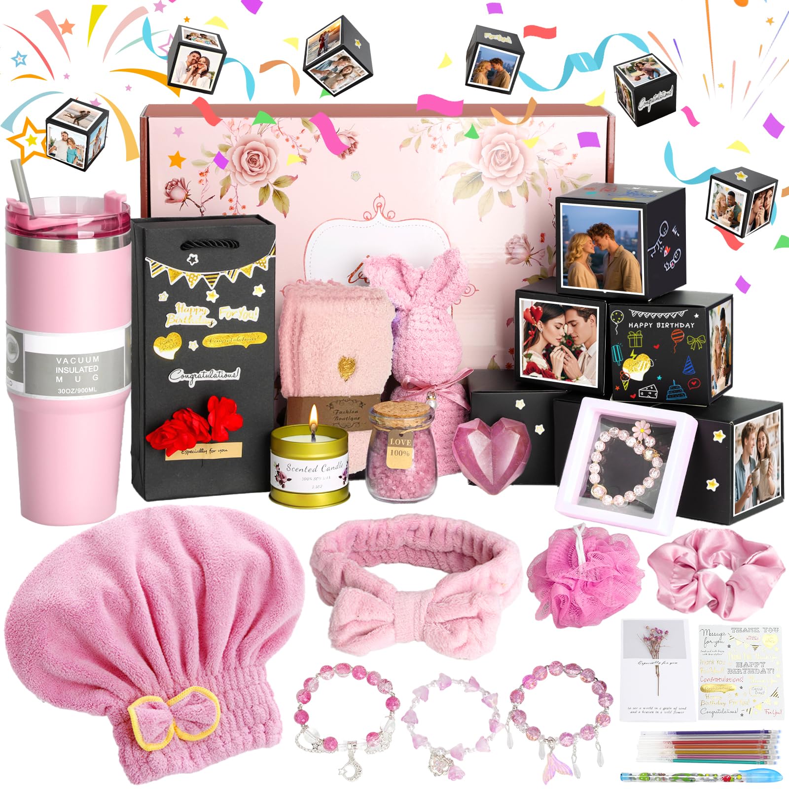 - 【Unique Birthday Gift Basket for Women】Celebrate her special day with a truly heartfelt present! Let this exquisite 21-piece birthday gift express your deepest emotions. Featuring a lavender-scented candle, personalized DIY photo pop-up box, 30oz premium tumbler, adorable rabbit towel, and complete spa accessories, this set creates an unforgettable unboxing experience. It’s the ultimate birthday gift basket for women—perfect gift for mom, wife, sister, daughter, girlfriend, best friend, and all special women in your life.