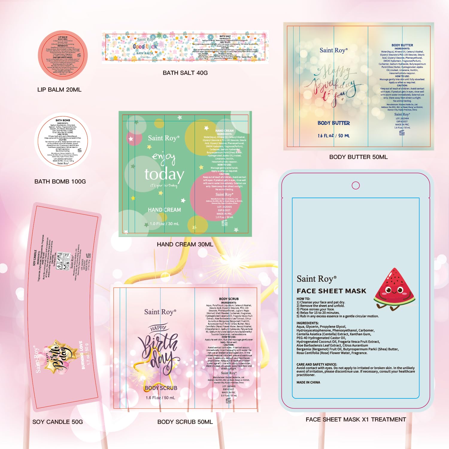 - 【Comprehensive Contents, All in One Box】The Spa kit Perfect Birthday Gift Set include Soy candle, Bath fizzer, Body scrub, Body butter, Hand cream, Bath salts, Overnight lip mask with spoon, Face mask, Face wash 3pcs set, Soft gel eye mask, Soft face towel, Key chain, 24pcs DIY Nail set in 1 happy birthday gift box. Everything you need for a luxurious self-care experience is right here