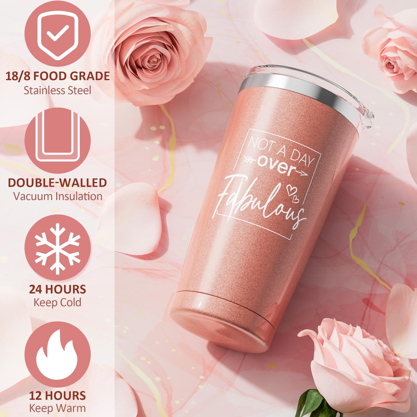 - INSULATED VACUUM TUMBLER: Made of 18/8 food-grade sturdy stainless steel, with double-walled vacuum insulation, this sweat-free insulated tumbler with lid can preserve beverage temperature up to 24h for cold & 12h for hot, great for iced coffee, tea, wine, juice, champagne, smoothies, sodas, milkshake, etc; "Not A Day Over Fabulous", positive quote printing brings her smile & happy mood every day, express your love and care, making it an ideal birthday gifts for her relaxing gifts for women