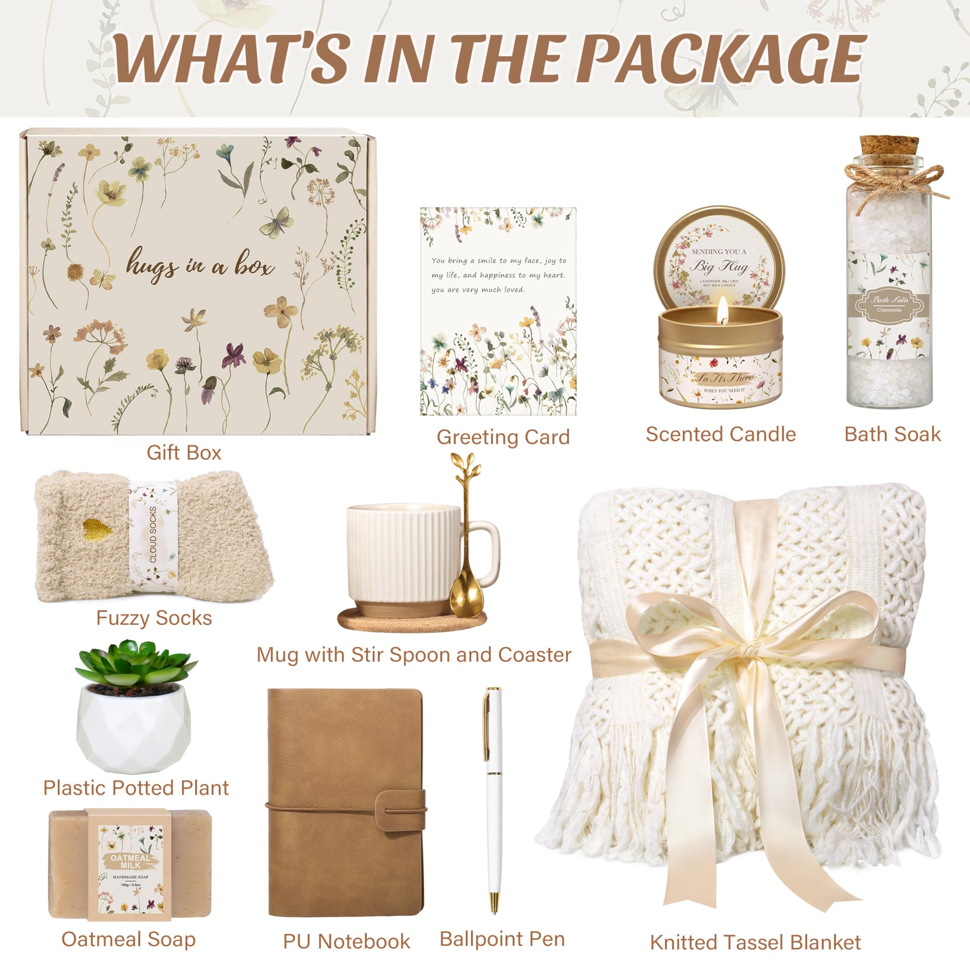 - Birthday Gifts for Women: Curated with premium items including a knitted blanket, ceramic mug with stirring spoon and coaster, scented candle, bath salt, handmade soap, fuzzy socks, plastic plant, PU notebook, ball pen, a greeting card and elegant gift packaging.
