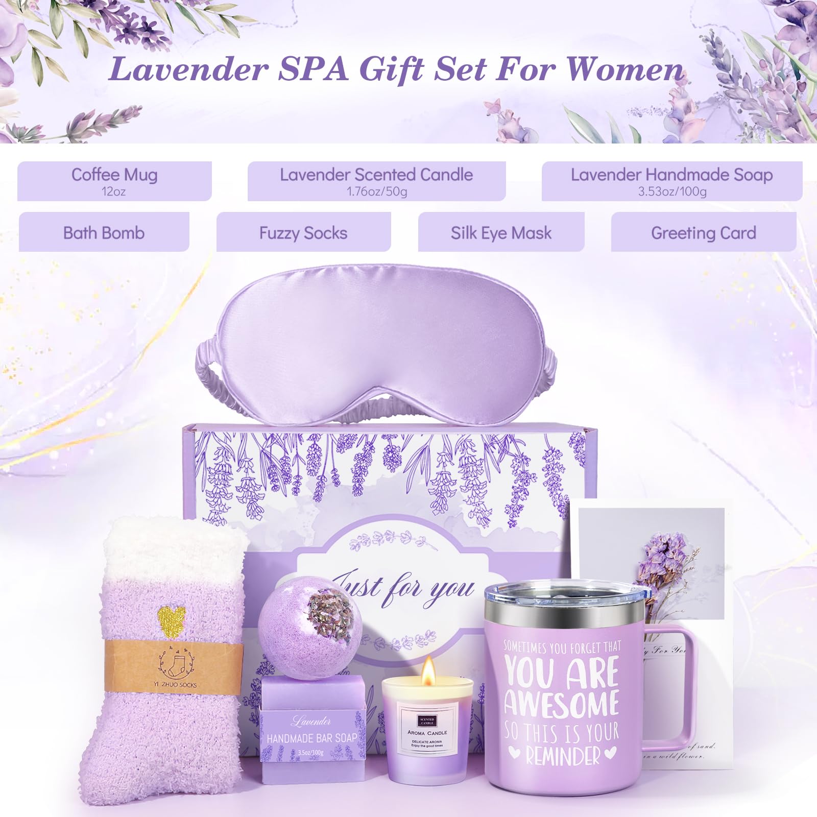 Birthday Gifts for Women Lavender Spa Gift Basket for Women Self Care Relaxing Bath Set Purple Gifts Inspirational Gift for Mom Wife Her Female Sister Teacher Nurse Friends Employee Coworker Spa Gifts