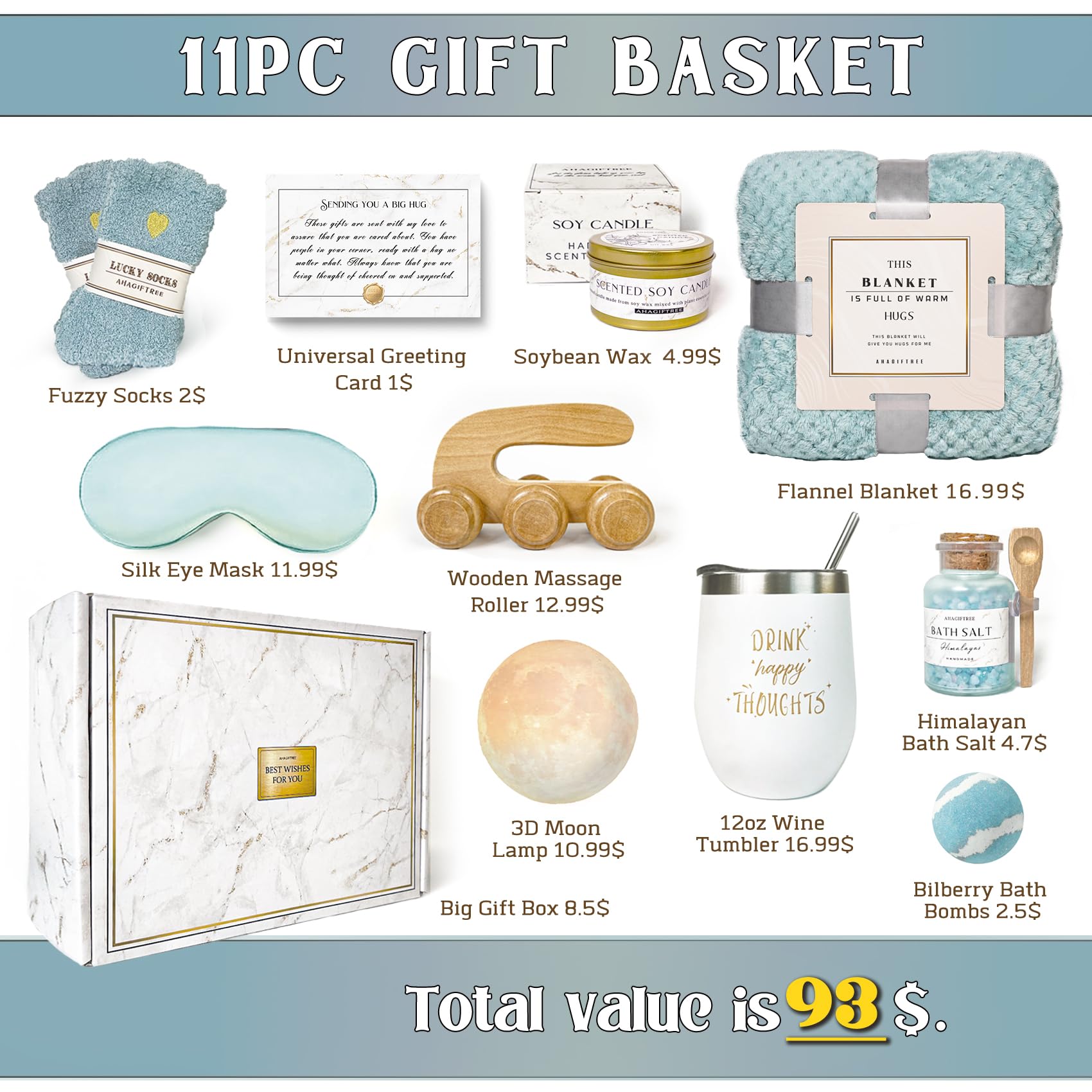- This women’s gift basket includes: 1 cozy blanket, 1 stylish mug, 1 massage roller, 1 moon lamp, 1 bath bomb, 1 bath salt, 1 pair of socks, 1 eye mask, 1 greeting card, and 1 gift box. Our customer service team is ready to assist you the moment your package arrives. If you encounter any issues, just let us know—we’re committed to making sure every customer is completely satisfied