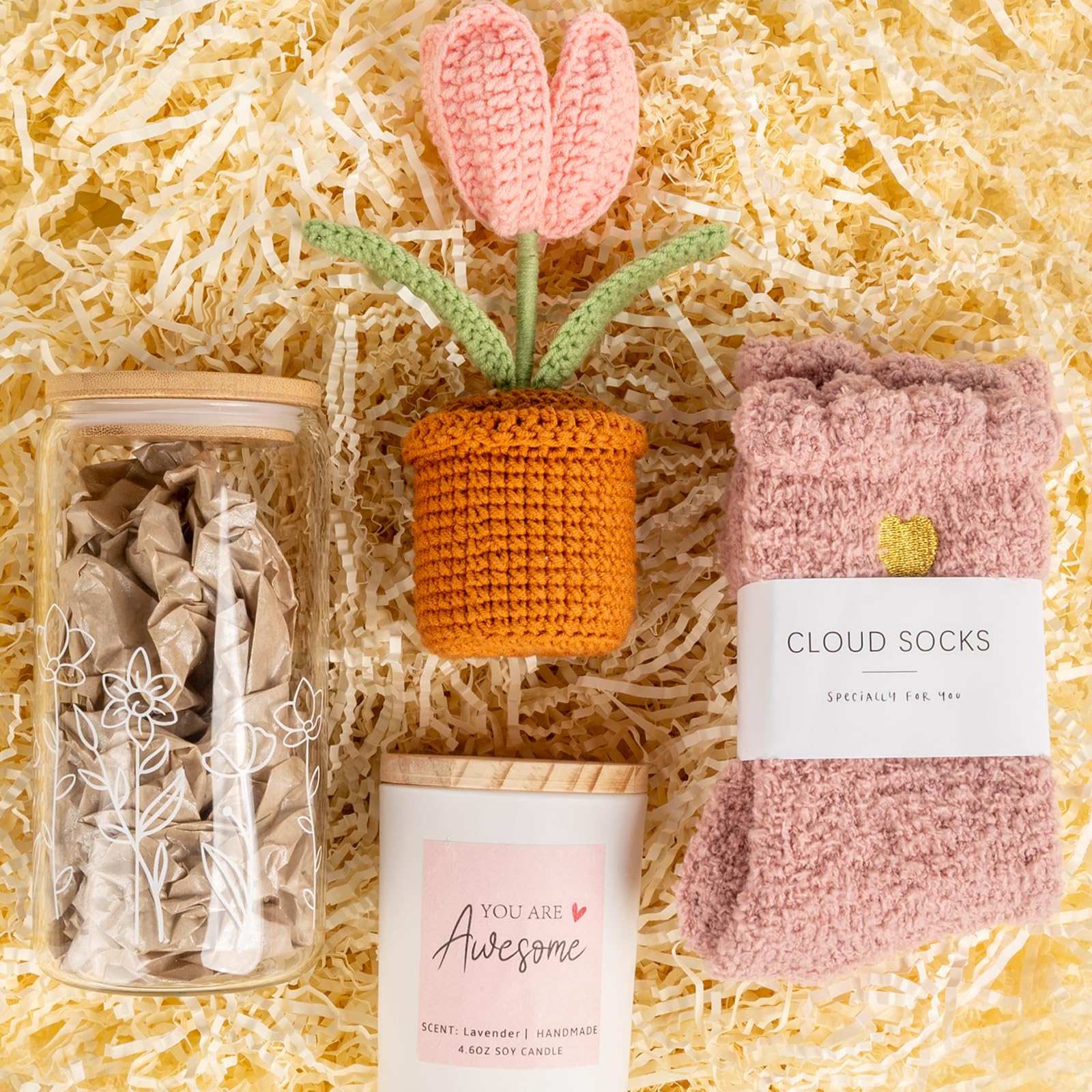 - WOMEN BIRTHDAY GIFT IDEAS: When she opens this elegant gift box, with its soft, elegant colors and fresh lavender scent, she will be filled with joy. Every object is designed to make her feel warm and encouraged. Inludes all 6 gifts: 1* 16oz wildflower glass coffee cup, 1* Handmade woven tulip potted plant, 1* "You are awesome" Lavender Soy Wax Scented Candle, 1* pair of soft fuzzy socks, 1* "happy birthday" gift card, 1* Gift Box.