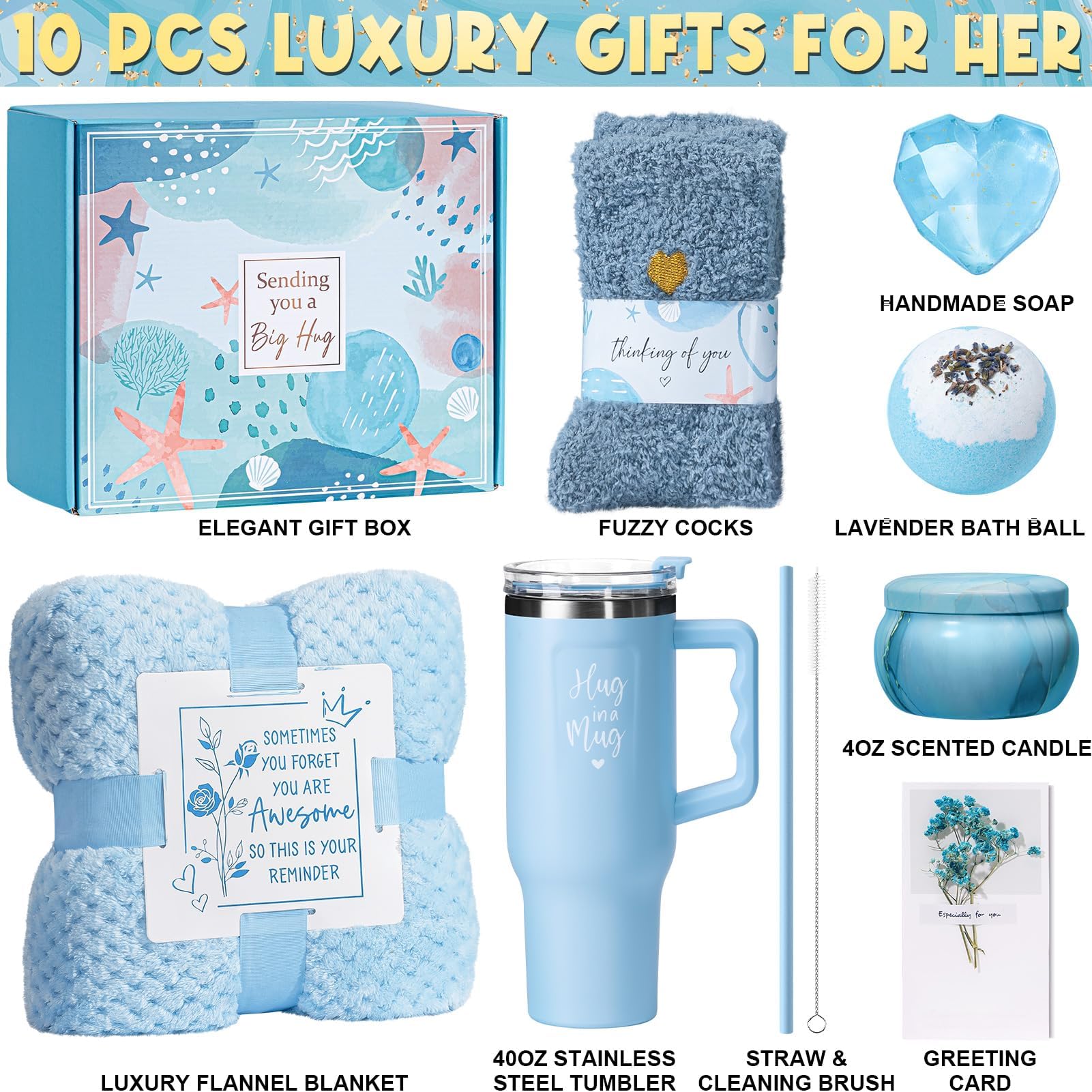 - 10 PCS SELF CARE GIFT FOR WOMEN: Qinline ocean relaxing spa gifts basket for Women contains all carefully designed items, including 40oz insulated tumbler with handle, luxurious flannel blanket, soft fuzzy socks, 1 silicone straws & 1 cleaning brush, 4oz lavender scented candle, handmade soap, bath bomb, dried flower gift card and elegant gift box. Perfect blue gifts as Christmas Gifts for Mom/Wife, Stress Relief Feel Better Gifts, Sympathy Gifts, Get Well Soon Gifts for Women