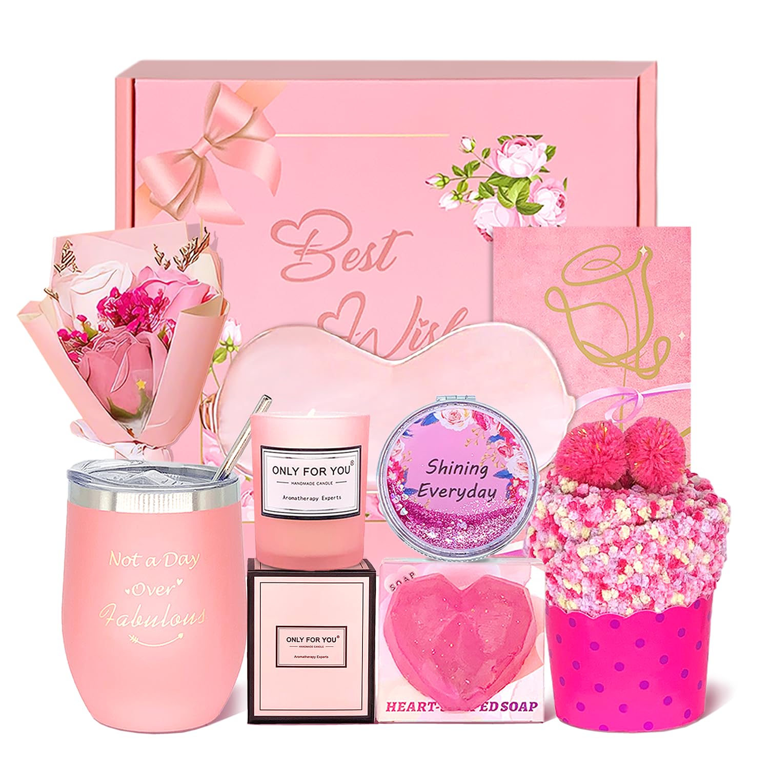 - 【Luxurious Gifts for Women】The exquisite luxury box and every item within, thoughtfully designed and meticulously selected by Bagmarvell, are intended to ignite happiness, warmth, and encouragement in the heart of the recipient. Each gift basket includes 1X Rose Bouquets, 1X 12 oz Rose Gold Tumbler, 1X Sleep Eye Mask,1X Heartshape Soap,1X Scented Candle,1X Cupcake Socks,1X Unique Greeting Card,1X Lovely Mirror. It will be a great surprise for her the moment she opens the box