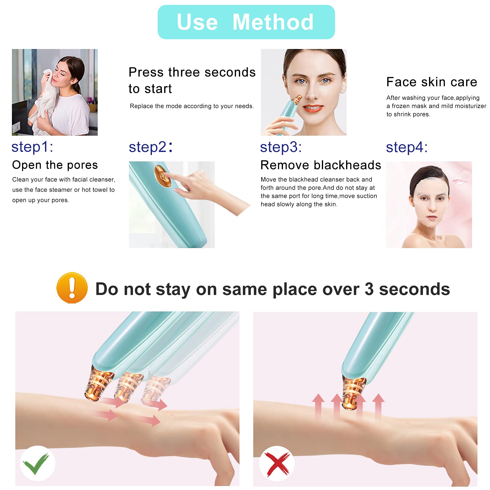 - 【Safe & Effective】Blackhead remover vacuum is made of eco-friendly ABS+PC material,non-toxic,non-irritating,which can be safely used on the face.Before use blackhead removal tool,please use hot compress apply on your face for 3-5 minutes to open the pore,and do NOT allow the probe to stay over 5 seconds on one place.USB recharge need around 2 hours. could support over 180 minutes consecutive use via a single charge which.