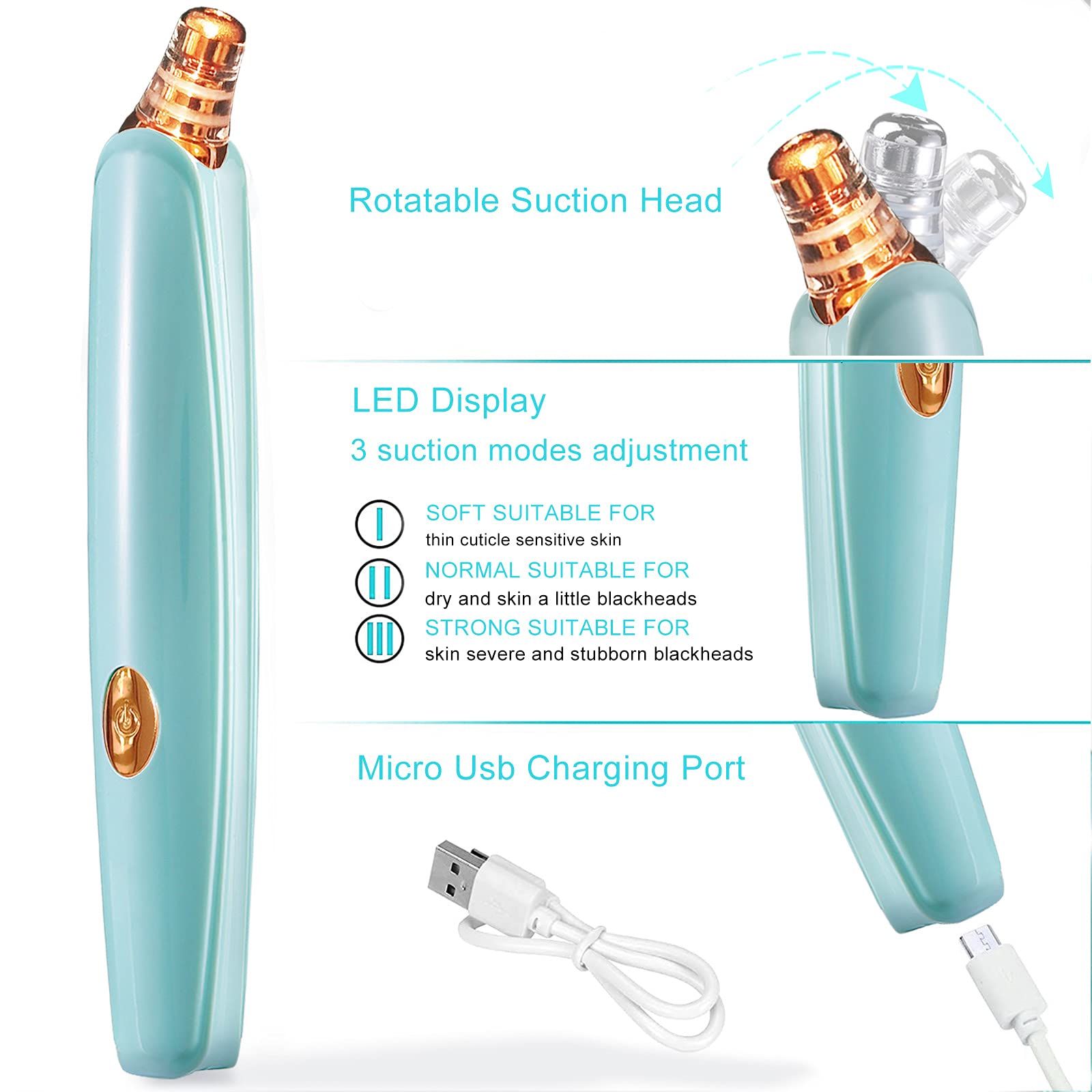 - 【5 Suction Probs】With a rotatable blackhead suction probes function, which can achieve a better experience by adjusting the angle of the suction probes.Microcrystalline head is gently remove dirt from rough epidermis.The 4 different round hole beauty head is suitable for large areas of blackheads on the face and T-shaped parts,and vulnerable and sensitive parts.