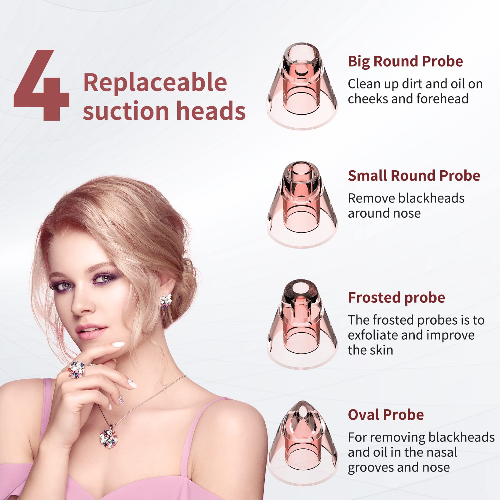 - 【4 REPLACEABLE PROBES&NO BRUISE LEFT】- We provide 4 replaceable probes,the big round probes has strong suction, easily clean up blackheads and lift skin; And the small round probe can moderate suction, clean acne in the wing of nose; The oval probe increases the elasticity and tightness of skin, reduce fine lines. With the use of cold red&blue LED, it can cool down the skin while sucking out blackheads, so no hickeys are left. It is noted that : DO NOT allow the probe stay too long on one place.