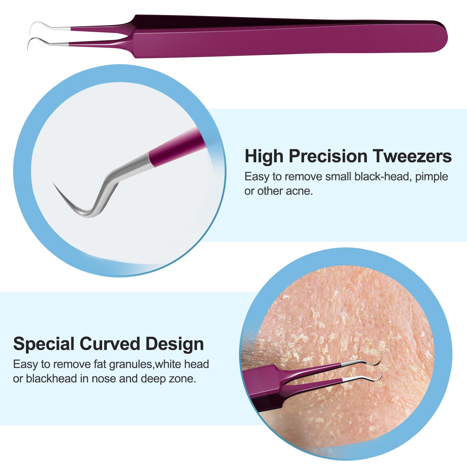 - Essential 5 Piece pimple extractor For skin care tools: Blackhead Tweezers with 3 different sharp needle: Blackhead remover tweezers are used to pluck out blackheads with exposed tips. 3 different sharp needle point help open the pore skin.