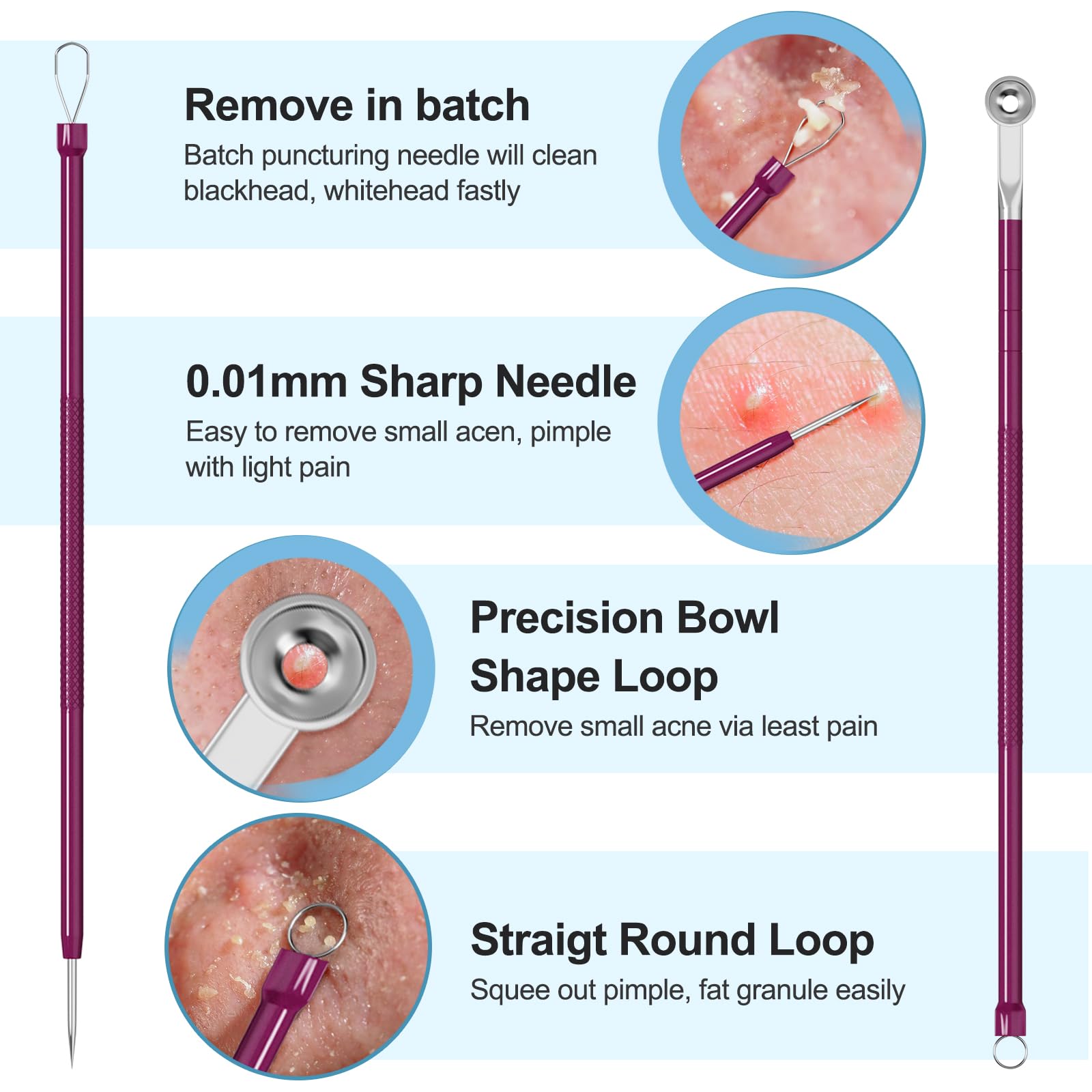- Pore Cleaner, 9 Functional ends--other 5 different sizes of loops: The loops(from small to big loop)of blackhead extractor can push and press to clean up every sizes of blackheads or blemishes effectively, even the hard to reach area, like the Necks, T-ZONE, etc