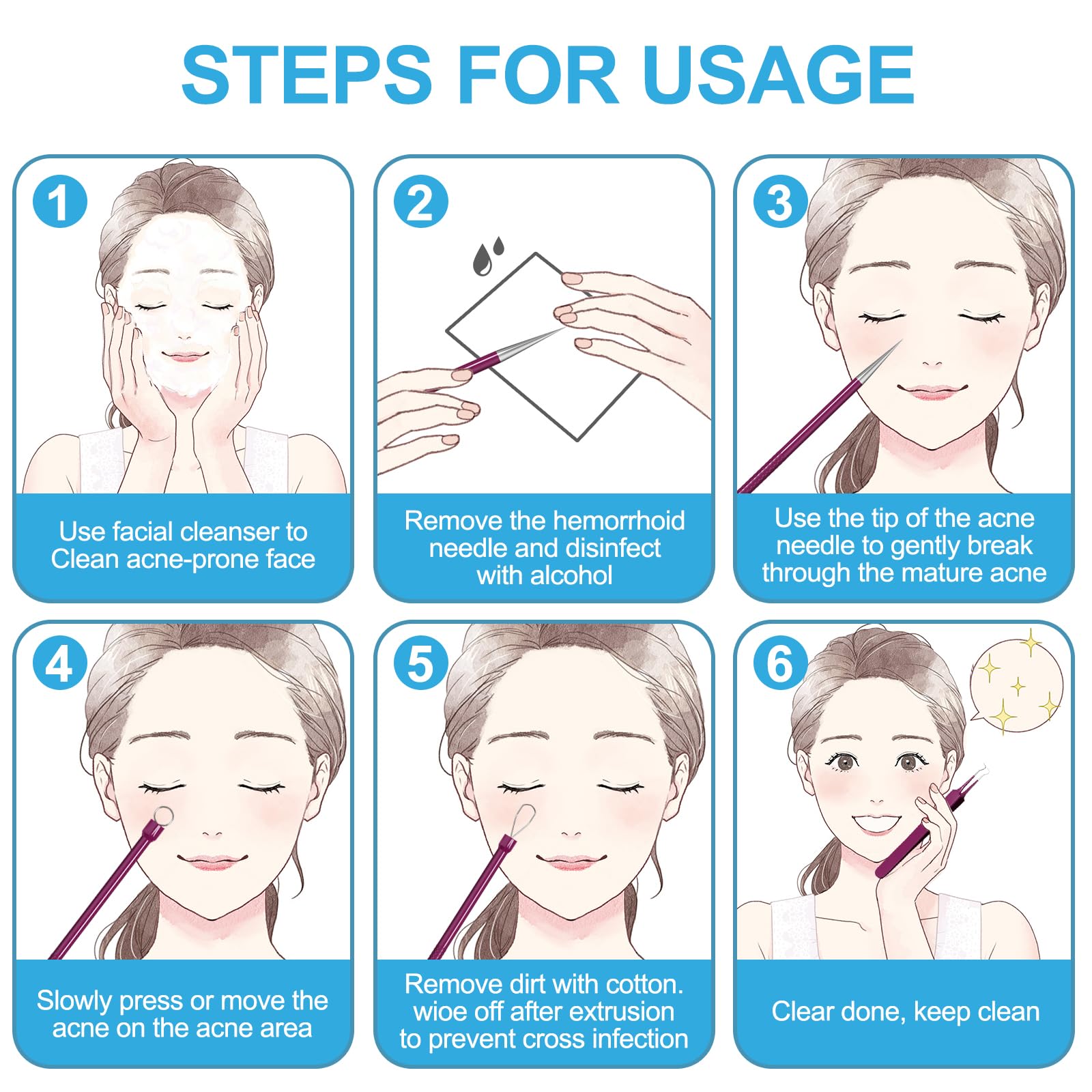 5. Wash hands and clean extractors: wash hands thoroughly with soap and warm water, then use medical grade alcohol and cotton swab to clean all acne kit.