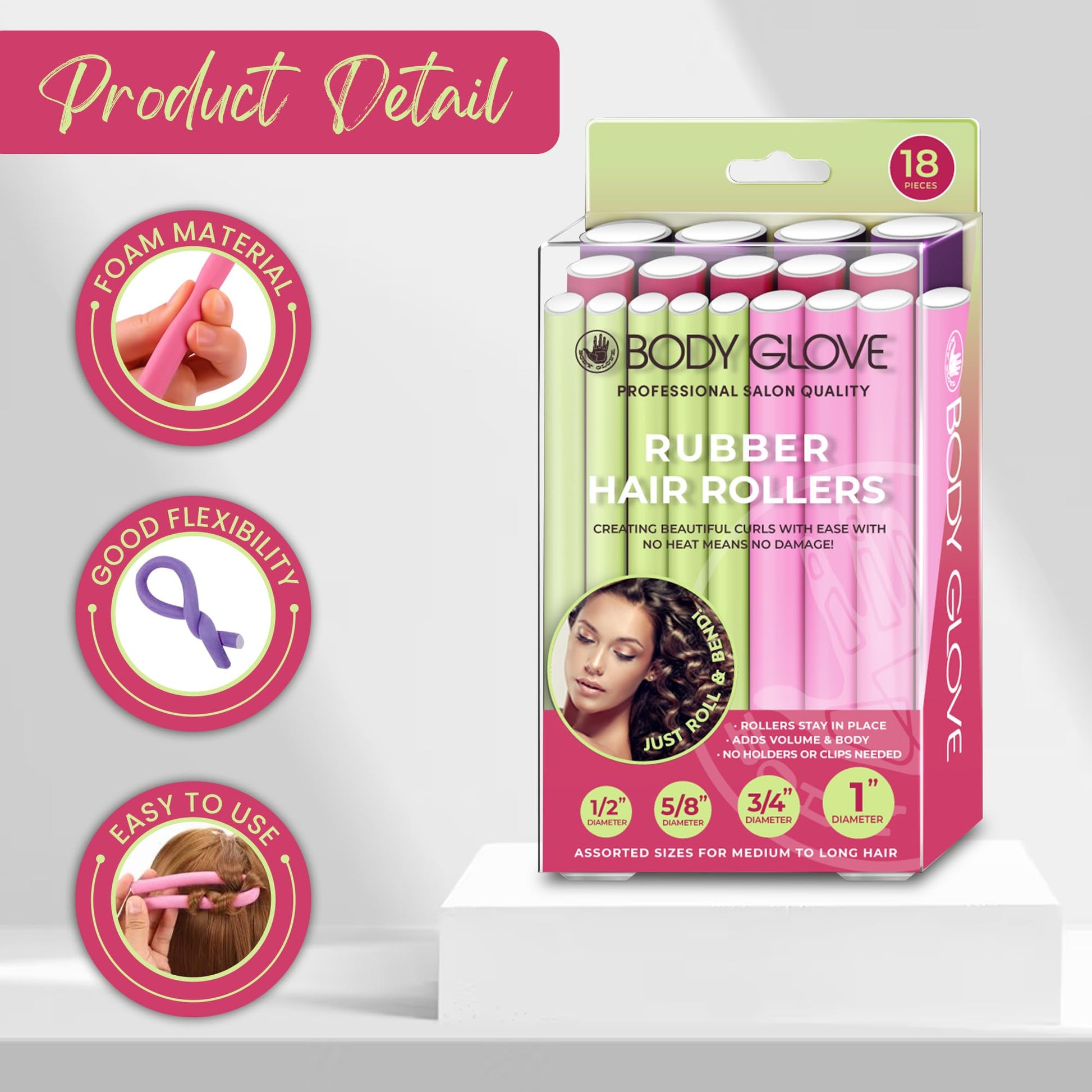 Body Glove Flexi Rods Foam Hair Rollers Medium to Large Size Professional Salon Quality 18 Pcs Rubber Hair Rollers For Medium to Long Hair (Multi-color)