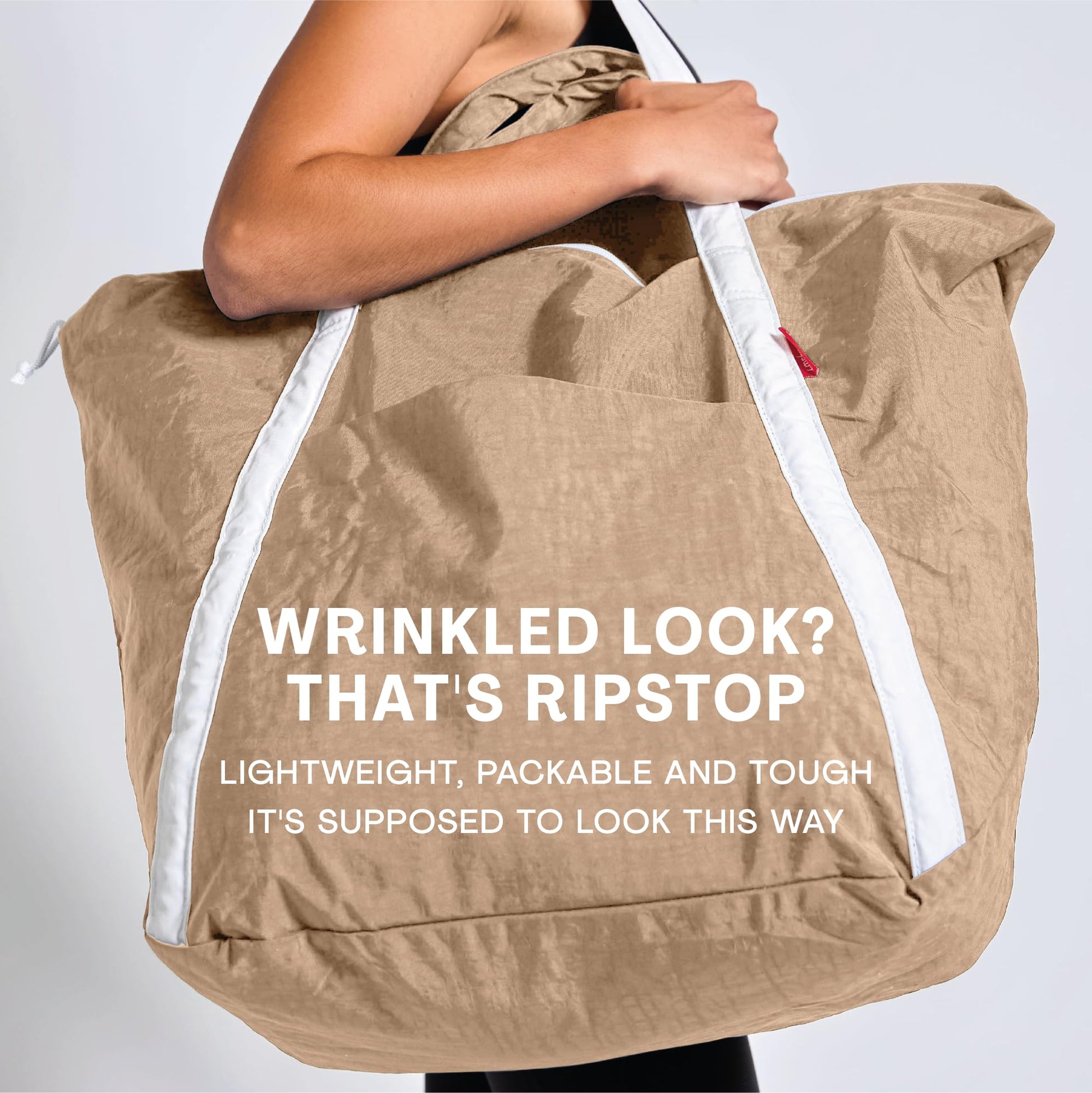 - SUSTAINABLY + DURABLY MADE: Made 100% post-consumer ripstop nylon, this beach tote bag keeps your essentials dry from splashes and free from sand while embracing sustainability