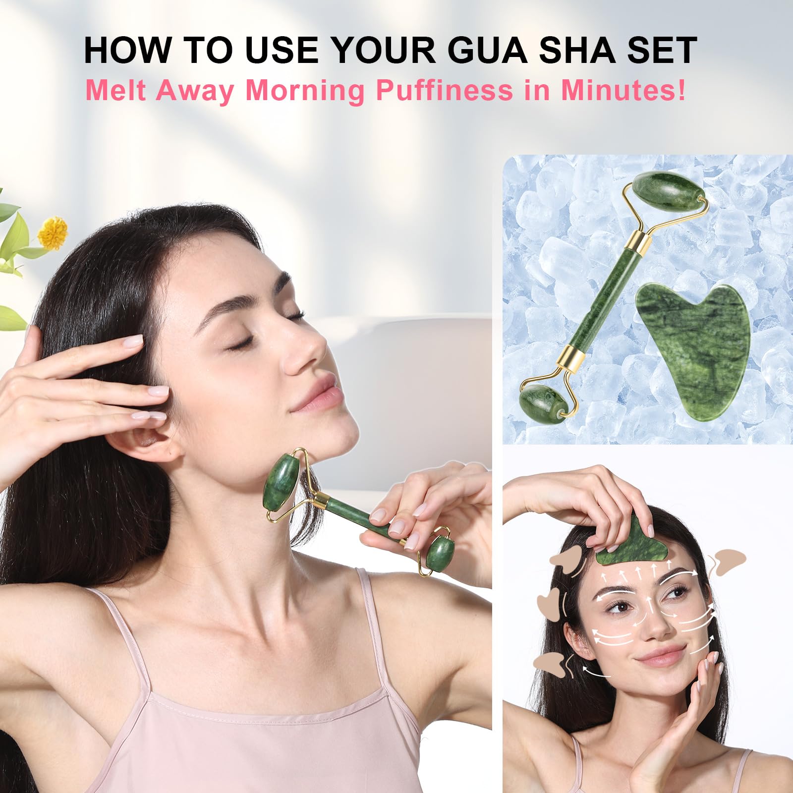 - [Relief Morning Puffiness] Combat morning puffiness with ease! The gua sha and facial roller massager stimulate lymphatic clearance, reducing facial swelling effectively. Use them as part of your morning routine to leave your skin looking refreshed and firm.