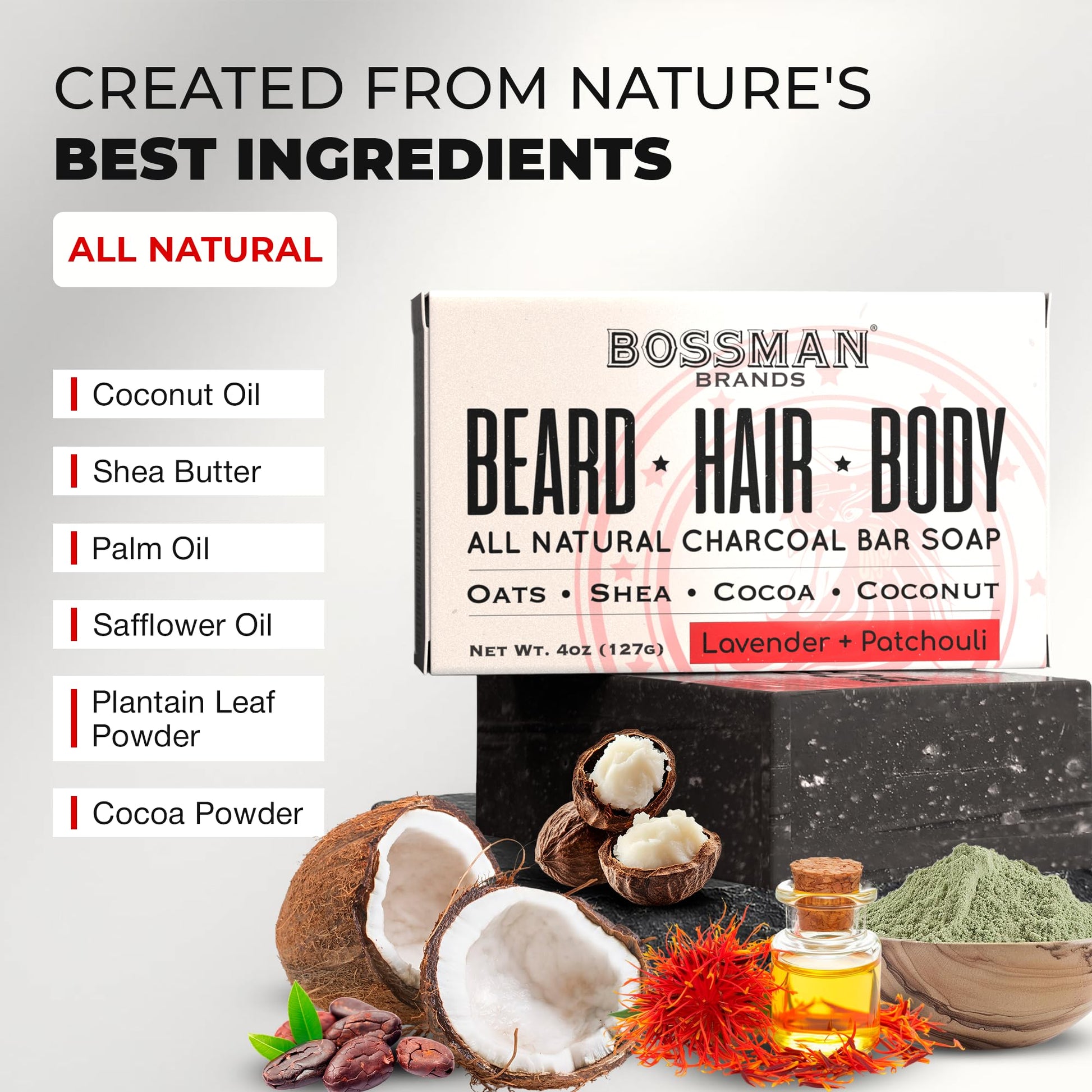 Bossman 4-in-1 Bar Soap for Men (4 oz) – All-Natural Beard Wash, Shampoo, Body Wash & Shaving Soap – Lavender & Patchouli Scent
