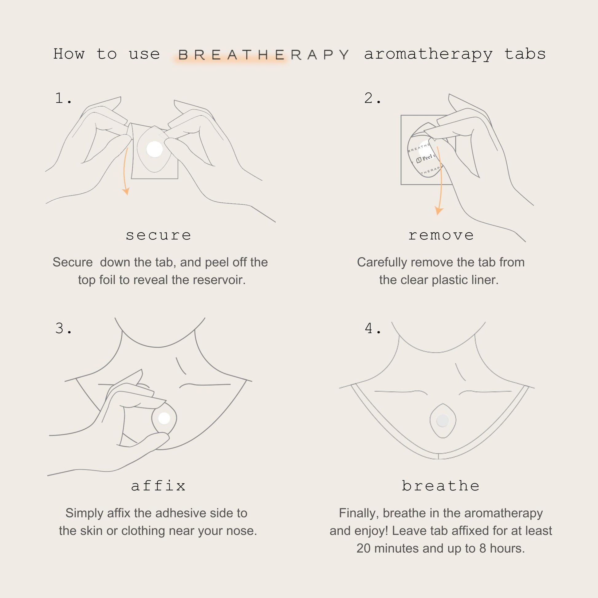 - INHALATION TECHNOLOGY: Receive a soothing aromatherapy experience through inhalation only technology. Leave tab affixed for at least 20 minutes and up to 8 hours. Breatherapy tabs will last 6-8 hours, so you can receive the benefits throughout your entire day.