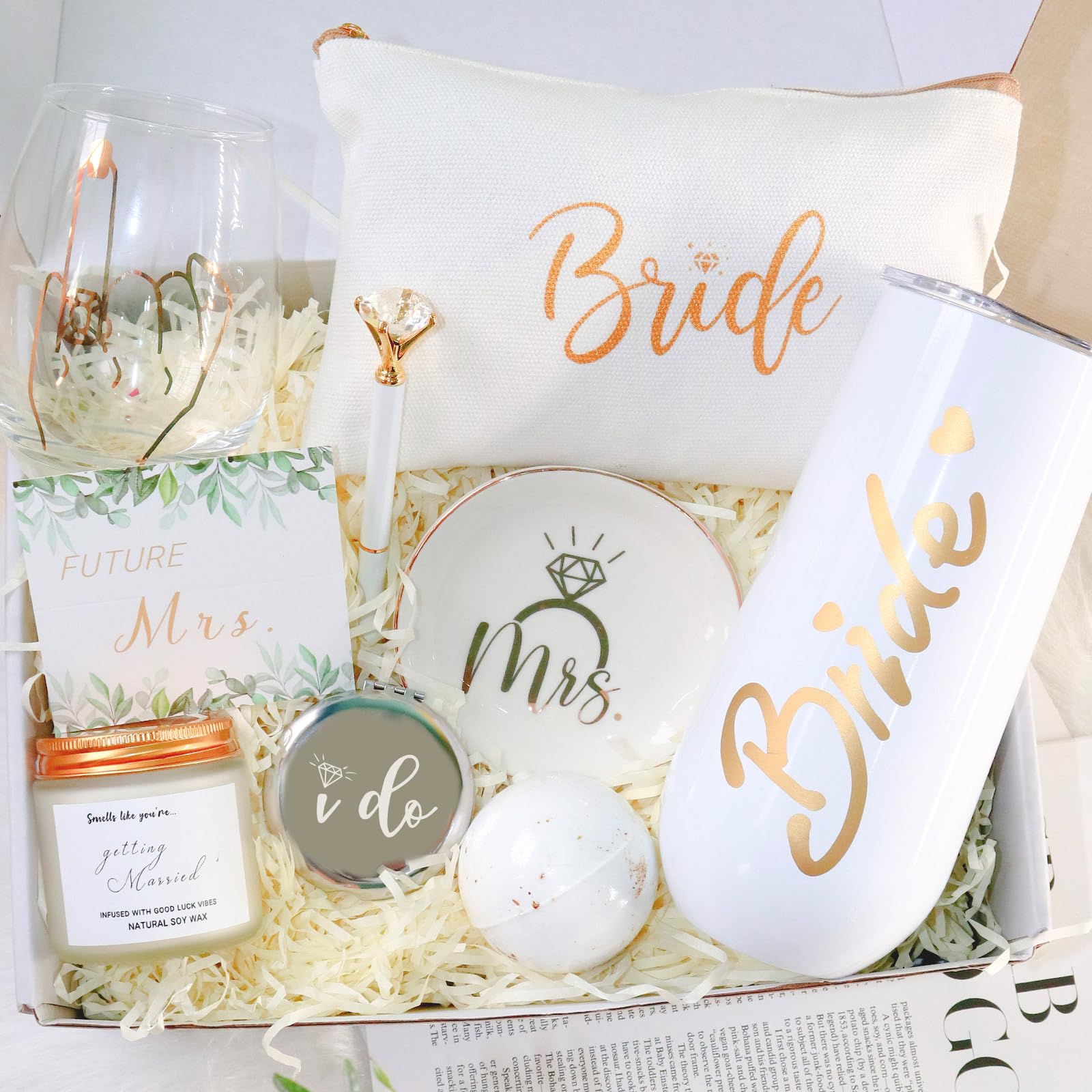 - 10 pcs: This bride to be gifts basket includes 1x Bride tumbler, 1x ring finger glass, 1x makeup bag, 1x "ido"mirror, 1x"Mrs"jewelry tray, 1x scented candle, 1x bath bomb, 1x diamond ballpoint pen, 1x greeting card, 1x premium gift box. Each item sits securely in the box and is ready to be gifted!