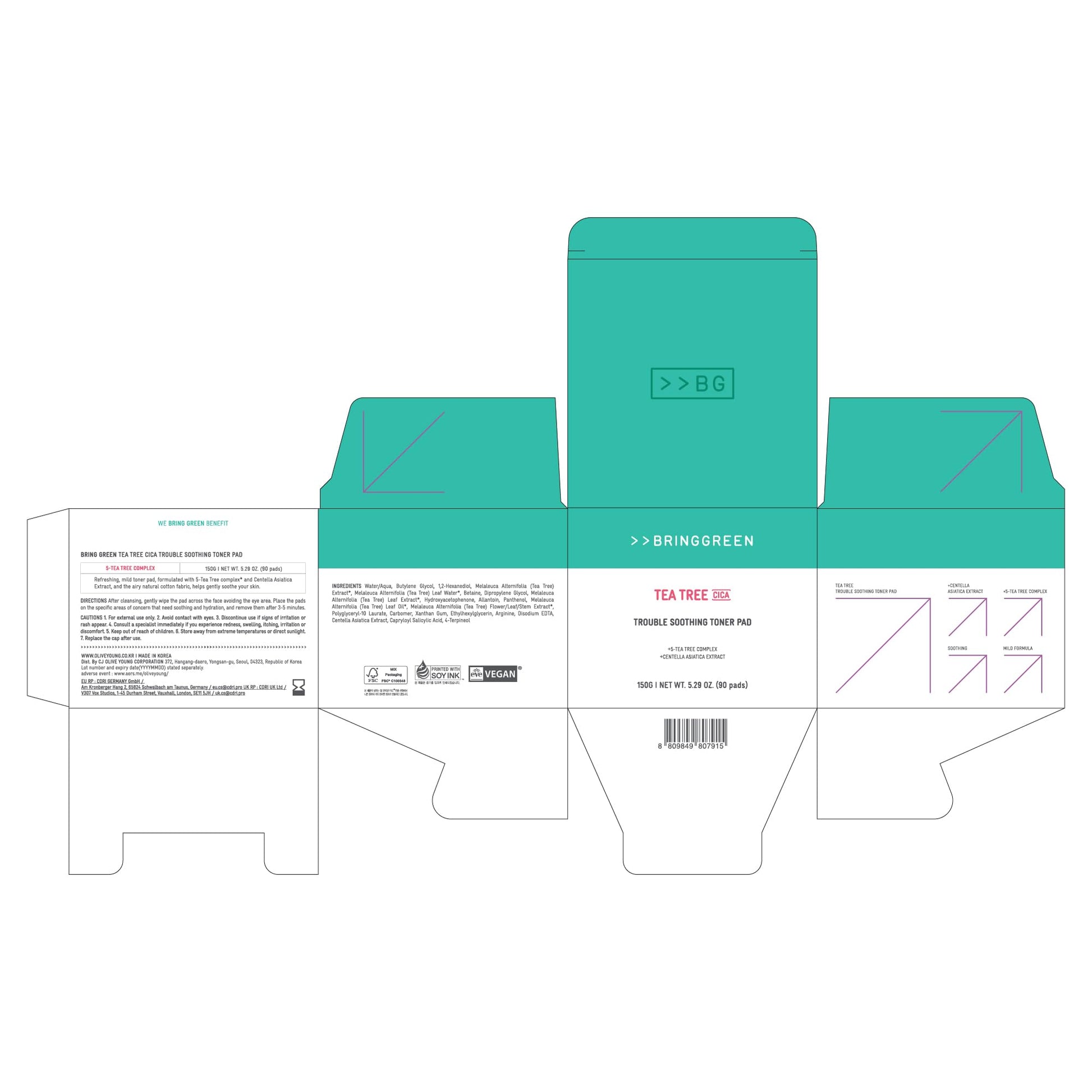 BRING GREEN Tea Tree CICA Soothing Toner PAD | Korean Daily Skincare Routine with Mild Formula, Cooling for Soothing and Hydrationg Effect, Vegan Certified Toner Pads 90 Count, 5.29 Fl. OZ.