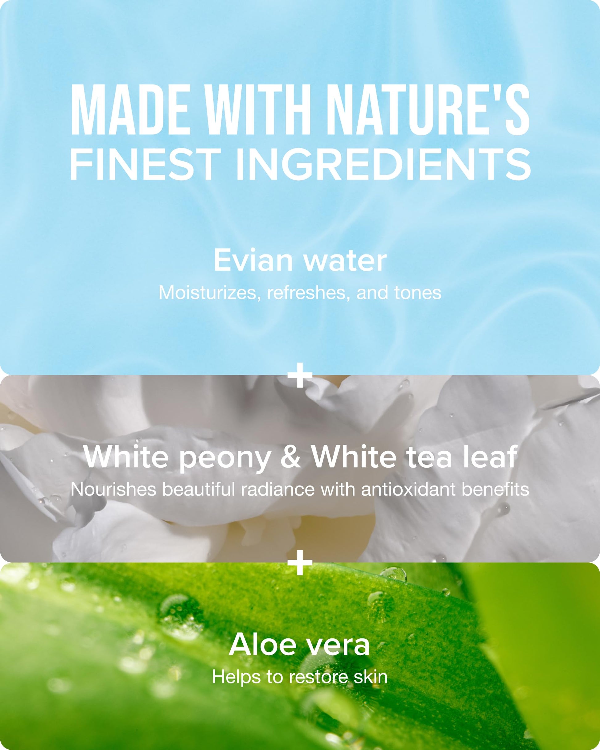 - Evian formulas were expertly crafted to incorporate only the finest organic plant extracts available with 99% natural origin ingredients