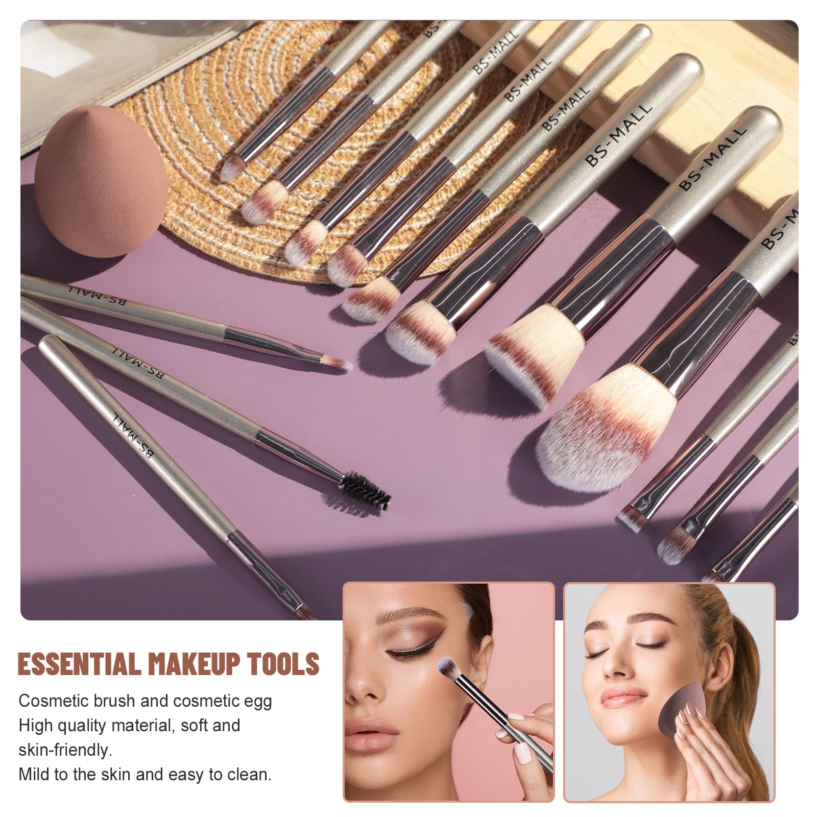 BS-MALL Makeup Brushes Set 14 Pcs with 1 Pcs Makeup Sponge – Essential Foundation Powder Concealers, Eye Shadows, Blush Makeup Brushes with Travel Makeup Case (Champagne)
