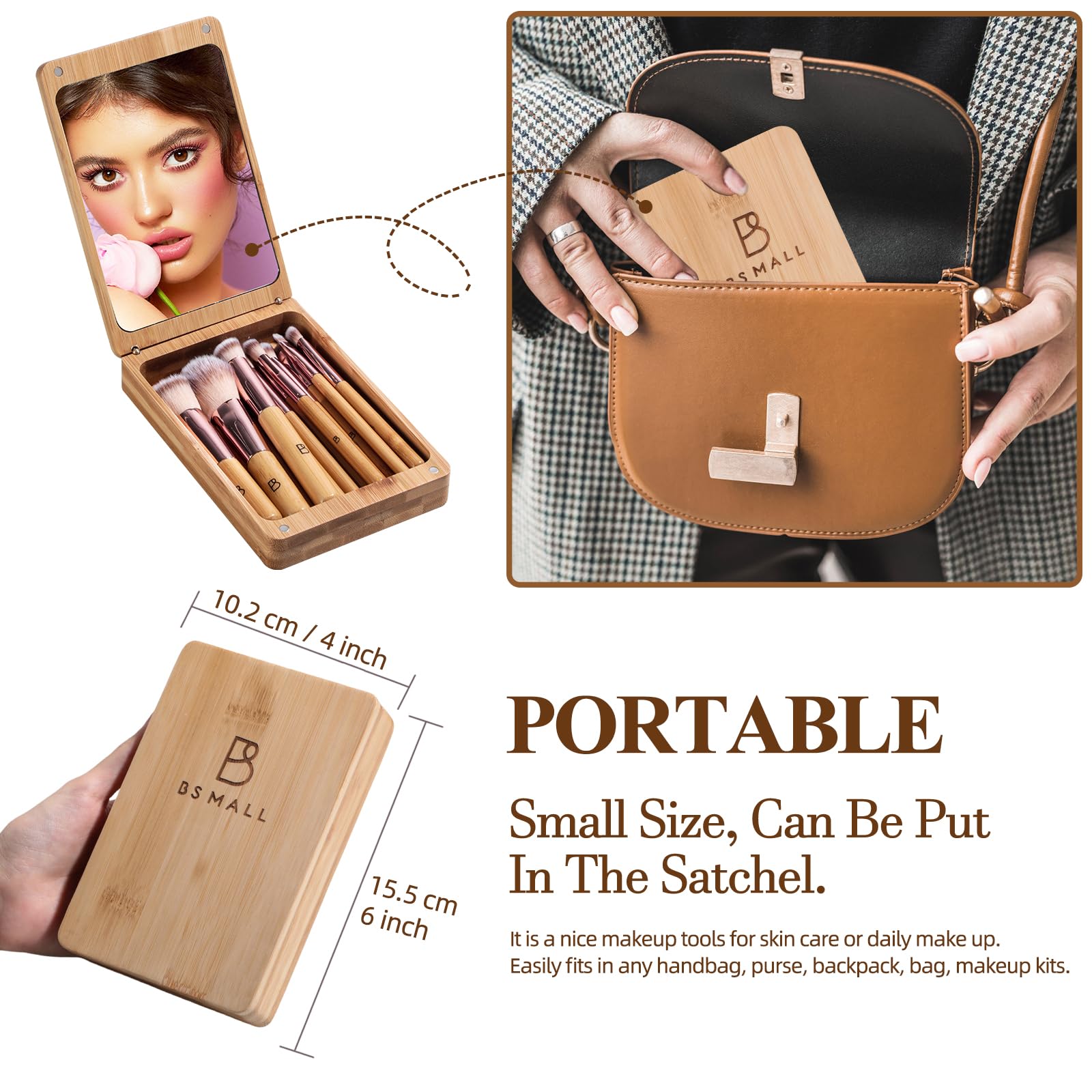 BS-MALL Travel Makeup Brush Set Kabuki Brushes Bamboo- Includes Eyeshadow Blush Brush & Foundation Brush For Liquid Makeup - 5X Magnifier Bamboo Mirror Case For Travel or On the Car Daily Use
