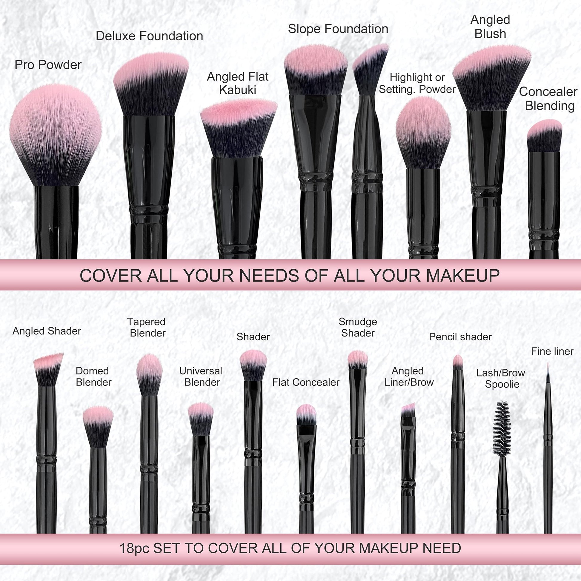 - 【7 Pcs Essential Face Brushes &11 Detail Brushes &High Quality Cute Brush Holder Case】Contains Deluxe Powder Brush,Foundation Brush,Ultimate Blending Brush, Slanted Powder Brush, Tapered highlighter Brush, Angled Contour Blush Brush,Mini Rounded Slant Concealer Brush; Smudge shader Brush,Crease Shader brush,concealer brush,Fine Eyeliner Brush, Dual eye brow spoolie brush Etc.