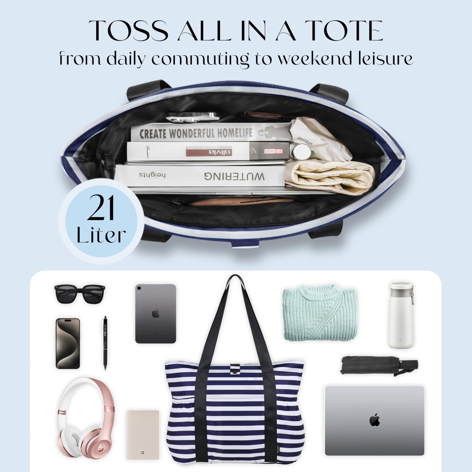 Buringer HOMESPON Large Foldable Beach Tote Bag for Women with Zipper Waterproof Handbag for Travel Shopping Gym Vacation (Blue Stripe)