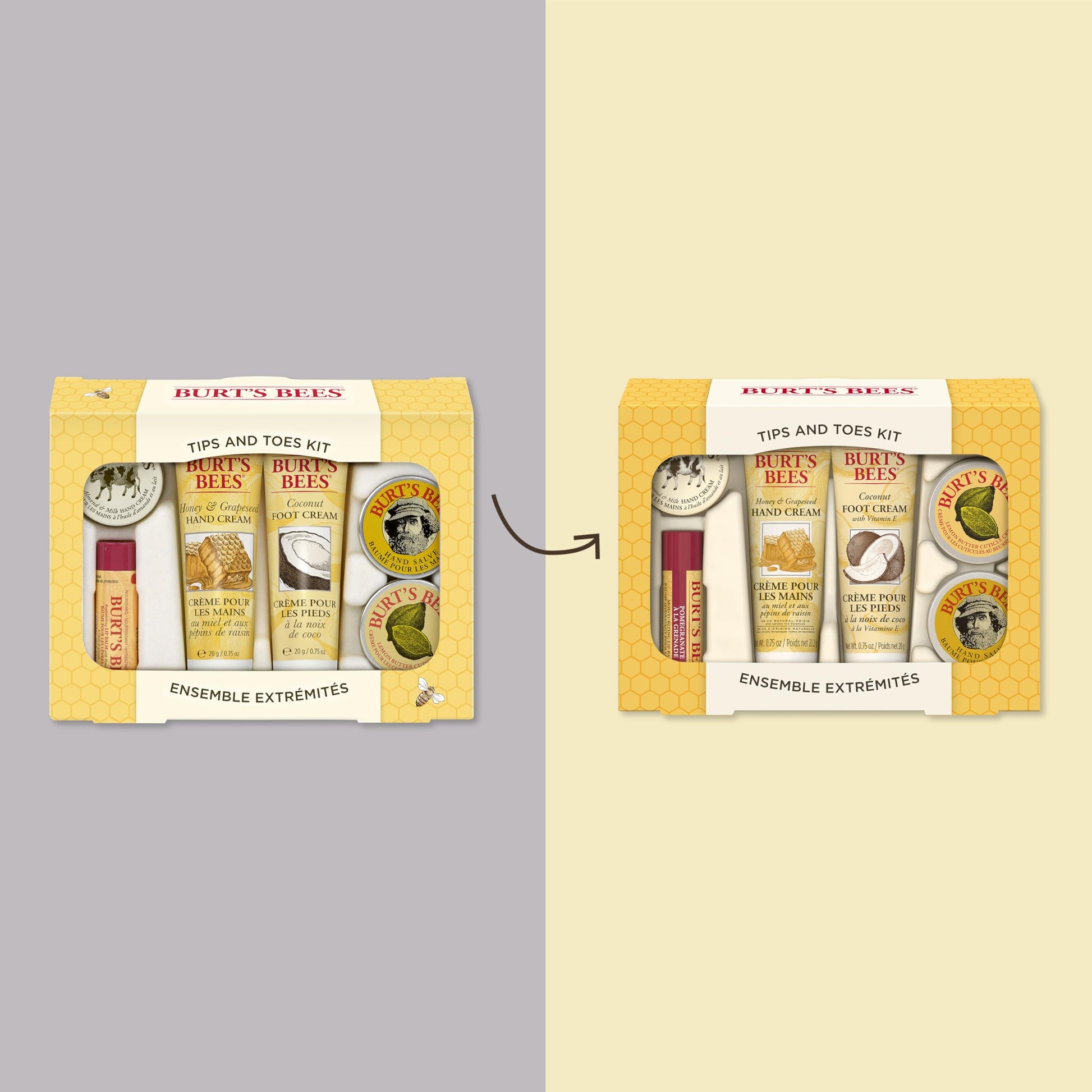 Details: Pamper hands and feet with Burts Bees Tips and Toes Gift Set which includes 5 trial size hand and foot favorites, plus a Pomegranate Lip Balm. Almond and Milk Hand Cream, Honey and Grapeseed Hand Cream, and Hand Salve moisturize dry hands, while Lemon Butter Cuticle Cream softens cuticles and nourishes nails. Feet also get spoiled with rejuvenating Coconut Foot Cream, and you can kiss dry lips goodbye, and add a hint of color, with revitalizing Pomegranate Lip Balm. This Burts Bees Tips and Toes Kit provides serious softening and hydrating for dry skin, and makes the perfect birthday or holiday present. Plus, the sweet packaging is designed to be gift ready so you can skip the wrapping. Give the gift of nourishment with Burts Bees gift sets.
