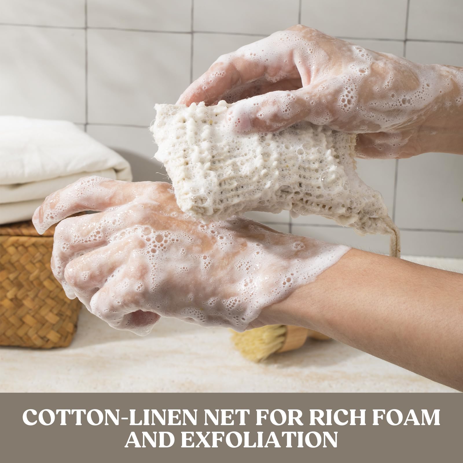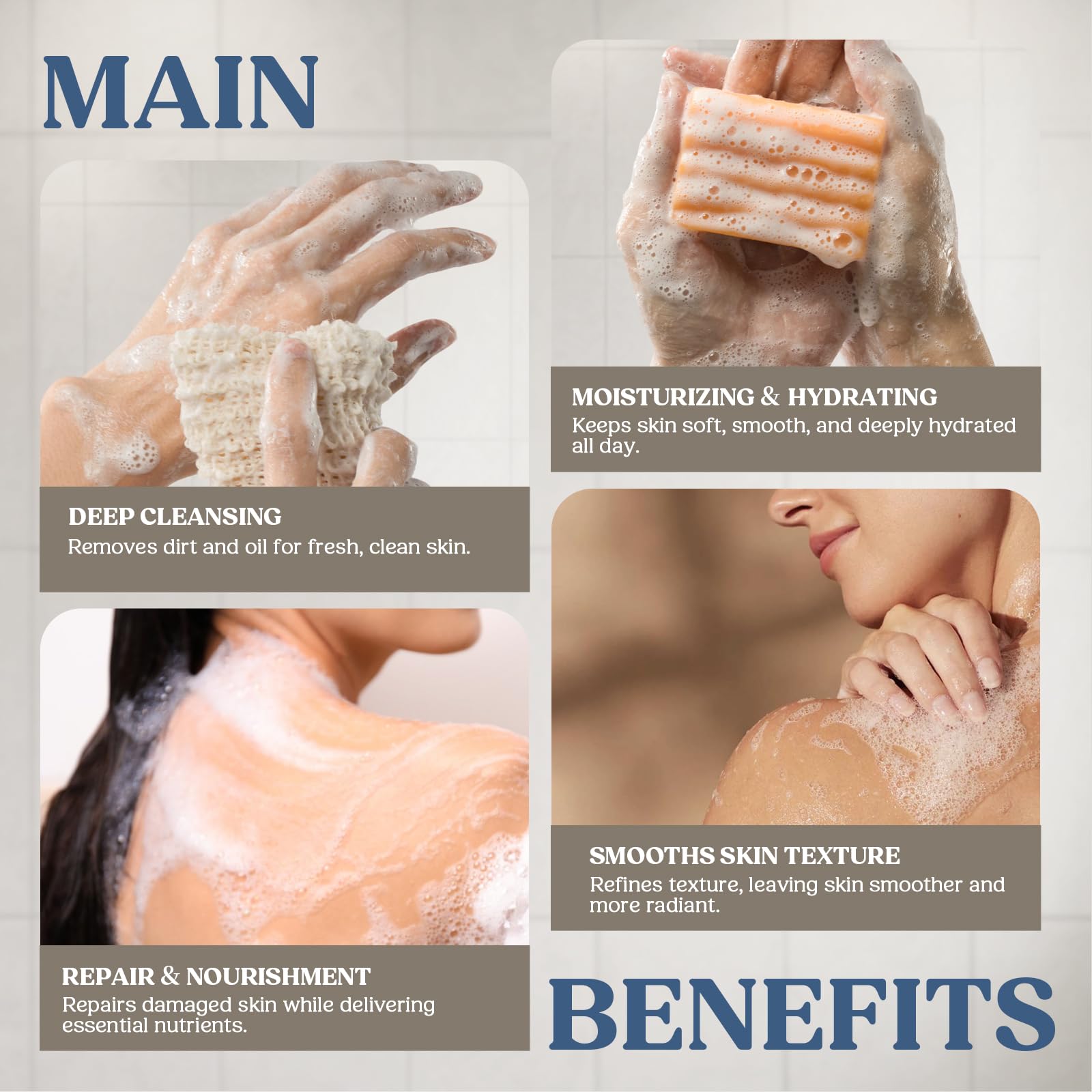 - Deep Cleansing & Nourishing. Infused with tea tree oil, coconut oil, shea butter, jojoba oil, honey, Oat granules and vitamin E, this bar soap deeply cleanses while hydrating the skin, leaving it soft, refreshed, and radiant. The included cotton-linen foaming sponge quickly creates a rich, delicate lather that penetrates pores to eliminate excess oil, dirt, and skin keratin.