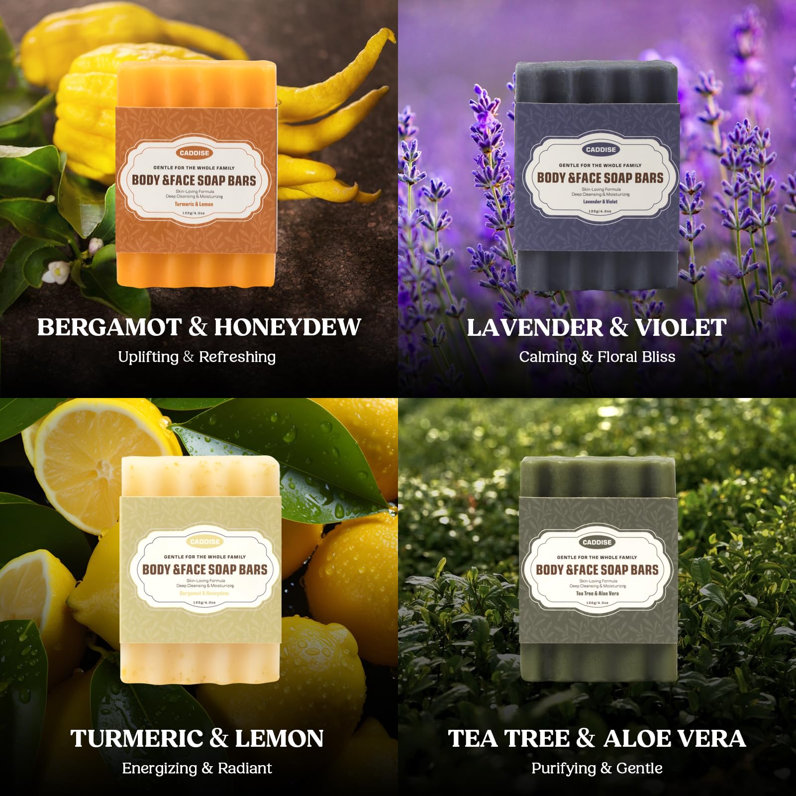CADDISE Natural Soap Bar – Cold Process Handmade Soap for Face & Body Wash, Moisturizing & Cleansing with Tea Tree & Coconut Oil, Shea Butter, Jojoba & Honey, Gift Set for Men & Women, 4 Pack 16.8 Oz
