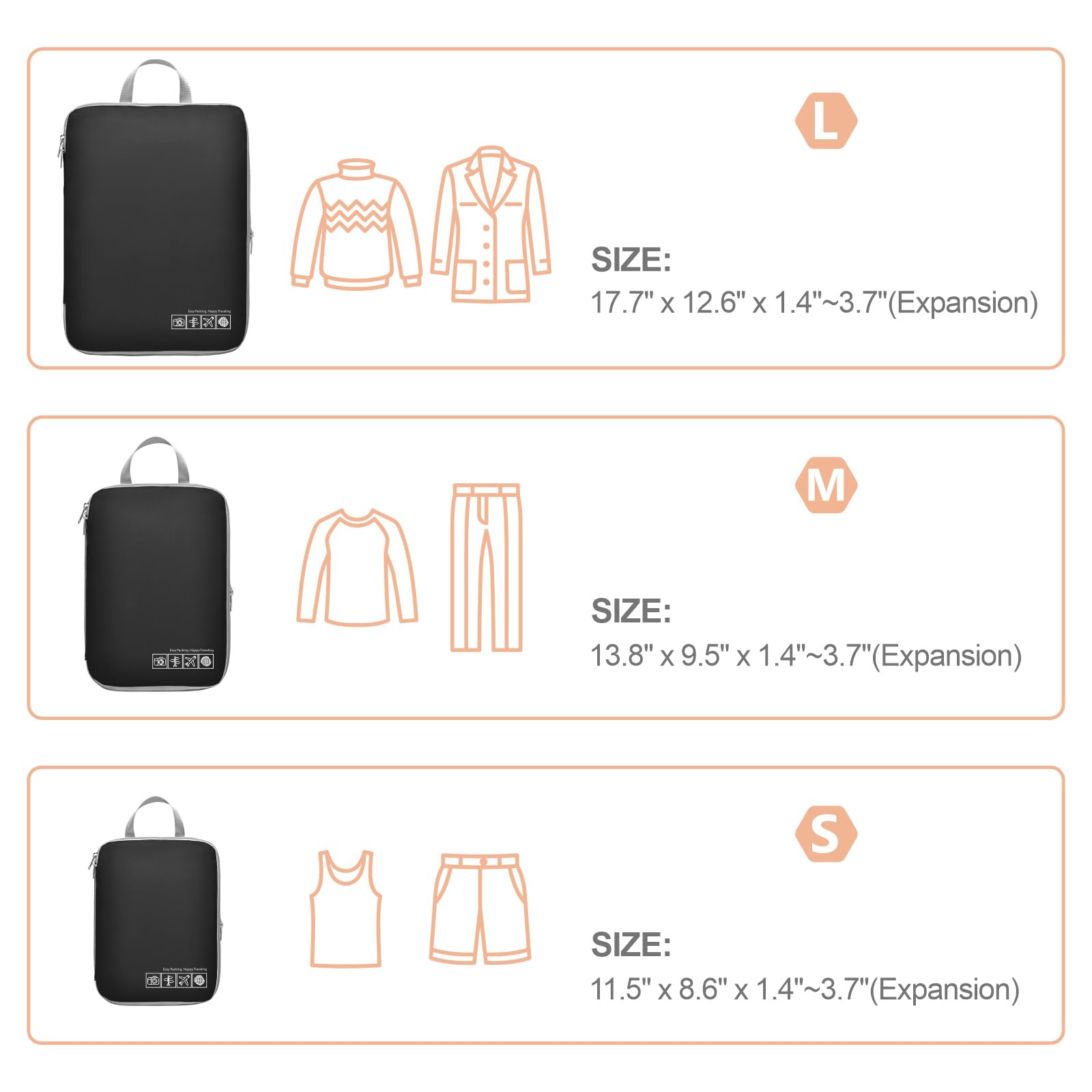 - Pack Light for Travel, No Wasted Space: Every inch counts with these travel packing cubes compression designed to fit suitcases perfectly; No more wasted space or overstuffed bags. Large(17.7"x12.6"x3.7") for jackets, sweaters, and trousers, Medium(13.8"x9.5"x3.7") for shirts and dresses, Small(11.5"x8.6"×3.7") for underwear and socks. Carry your essentials effortlessly