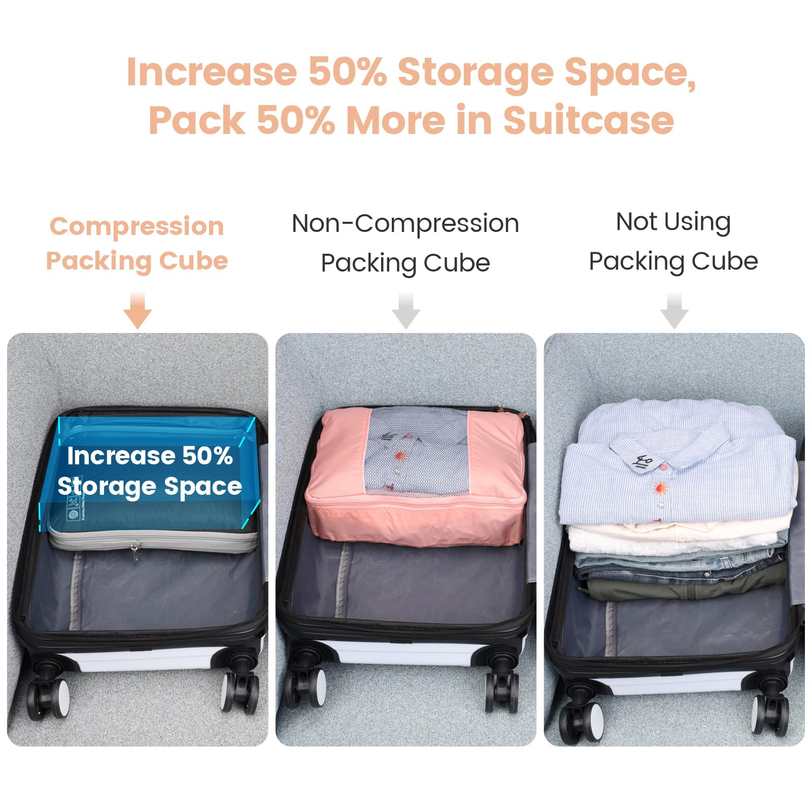 - Pack More in Less Space: Maximize your luggage space with our space saving packing cubes for travel! The compression zipper design helps save up to 50% storage space, allowing you to fit up to 50% more in the suitcase; it can also compress clothing securely to prevent shifting and wrinkles. Perfect for travelers who want to pack efficiently