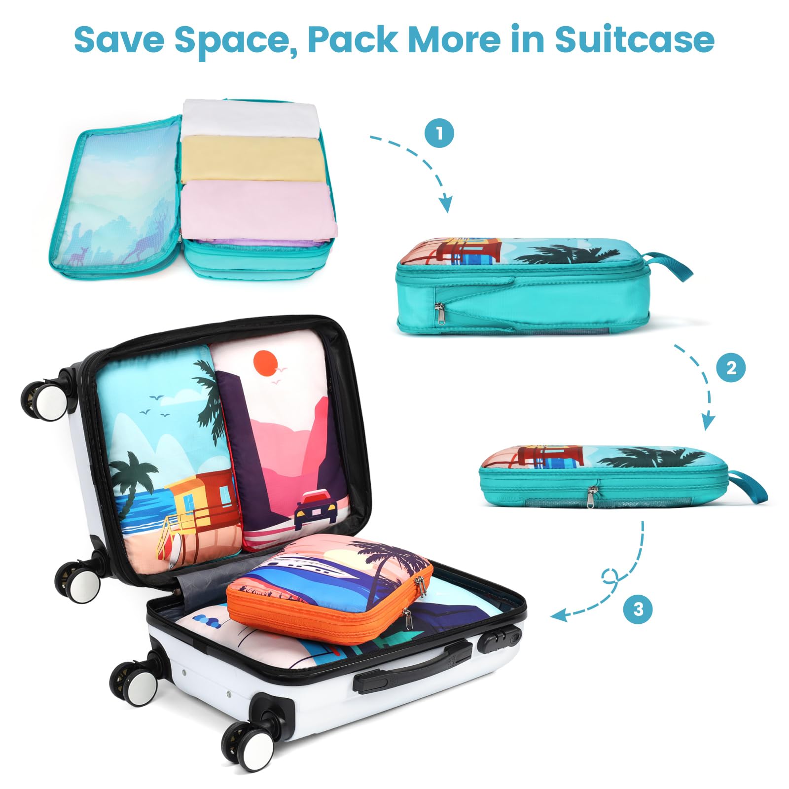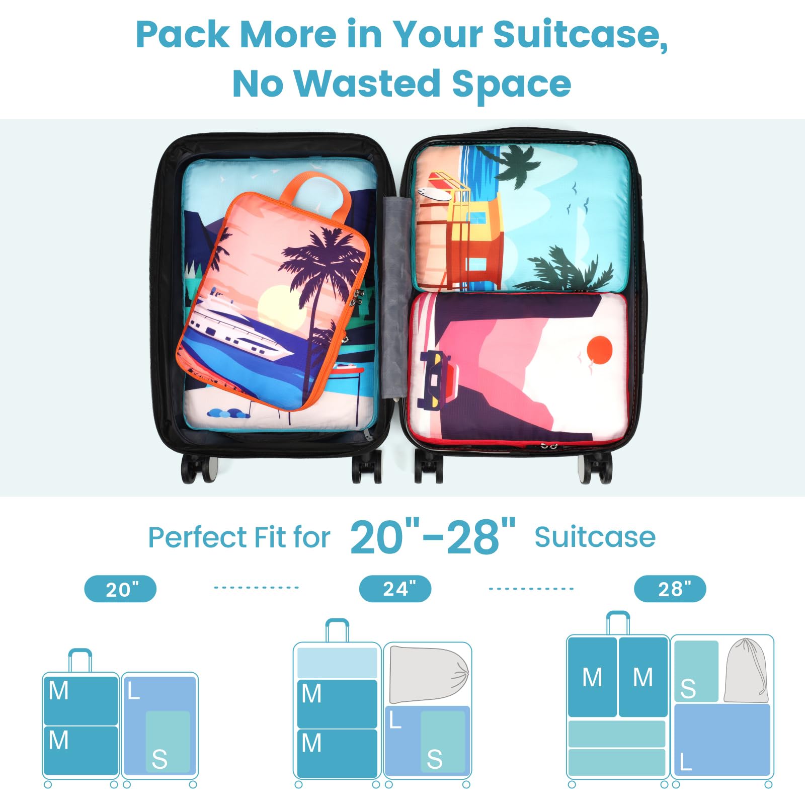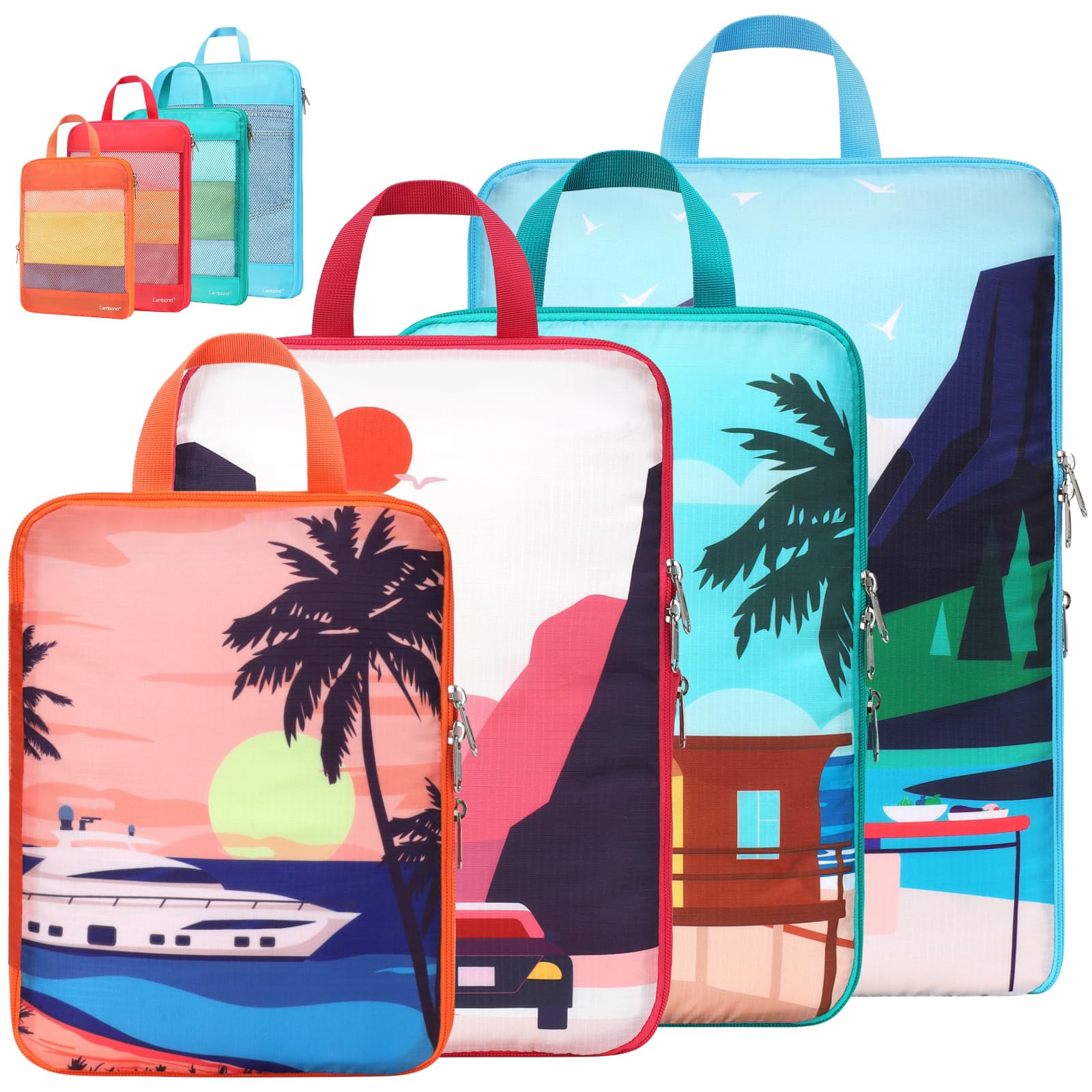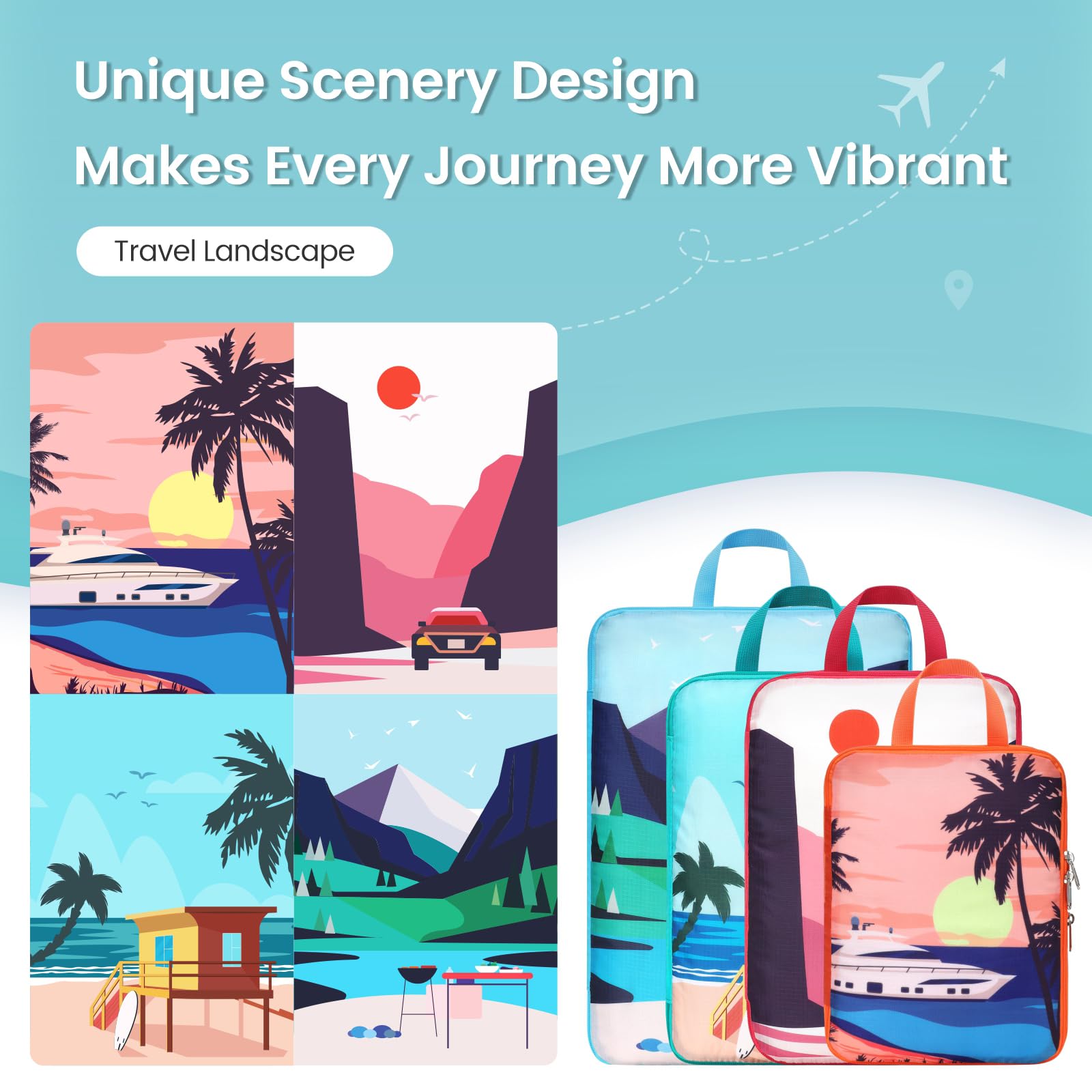 - Unique Scenery Design Makes Every Journey More Vibrant: Our compression packing cubes travel feature unique designs celebrating breathtaking Travel landscapes, from serene beaches to canyon sunsets. Their perfect blend of functionality and style adds vibrancy to each trip, enhancing your travel experience